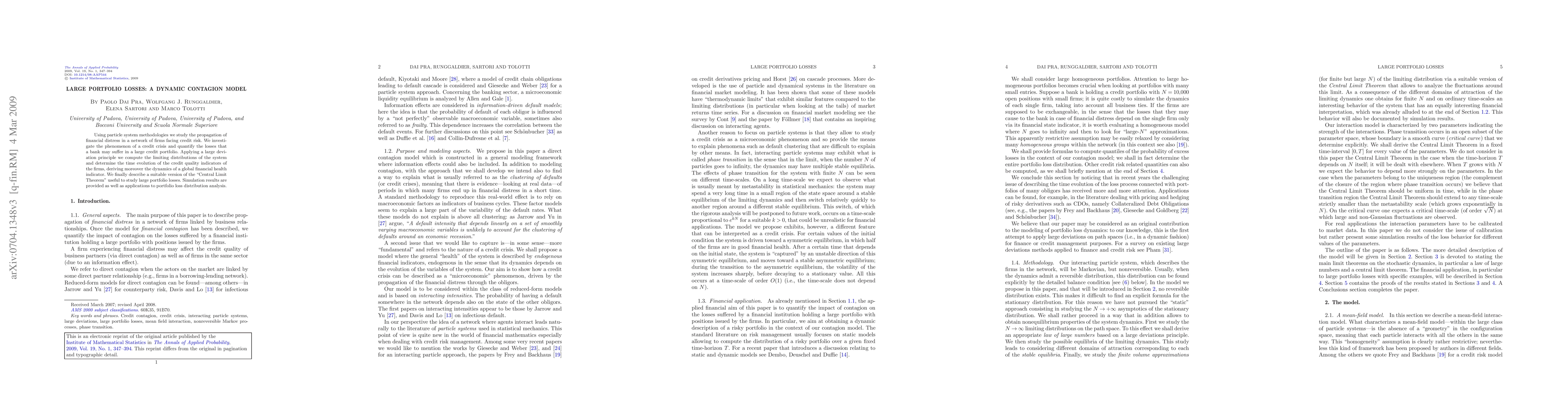 Using particle system methodologies we study the propagation of financial distress in a network of firms facing credit risk. We investigate the phenomenon of a credit crisis and quantify the losses that a bank may suffer in a large credit portfolio. Applying a large deviation principle we compute the limiting distributions of the system and determine the time evolution of the credit quality indicators of the firms, deriving moreover the dynamics of a global financial health indicator. We finally describe a suitable version of the "Central Limit Theorem" useful to study large portfolio losses. Simulation results are provided as well as applications to portfolio loss distribution analysis.
