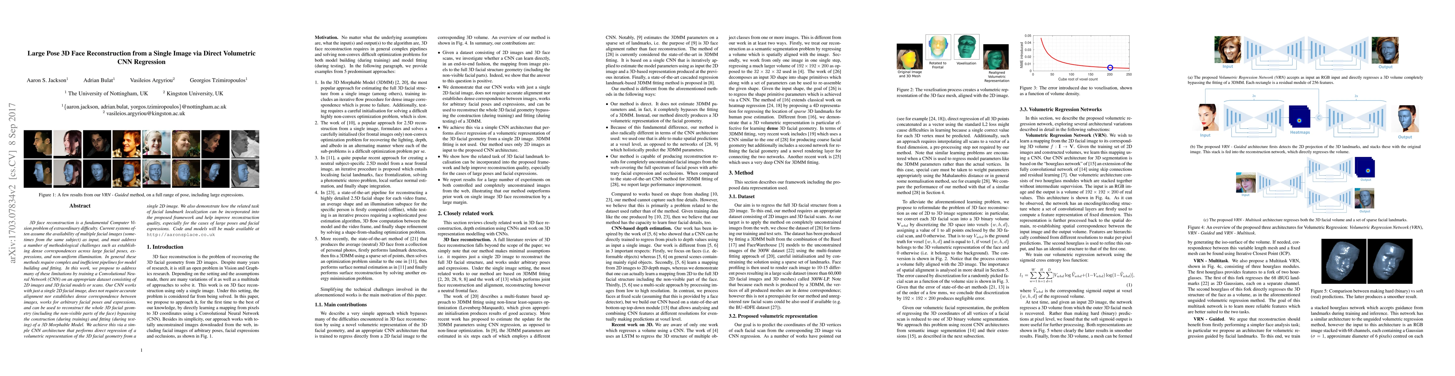 This paper proposes a Convolutional Neural Network (CNN) for reconstructing 3D facial geometry from a single 2D image, bypassing the need for multiple images or complex model fitting. The CNN directly regresses a volumetric representation, enabling reconstruction for large poses and expressions without requiring alignment or correspondence.