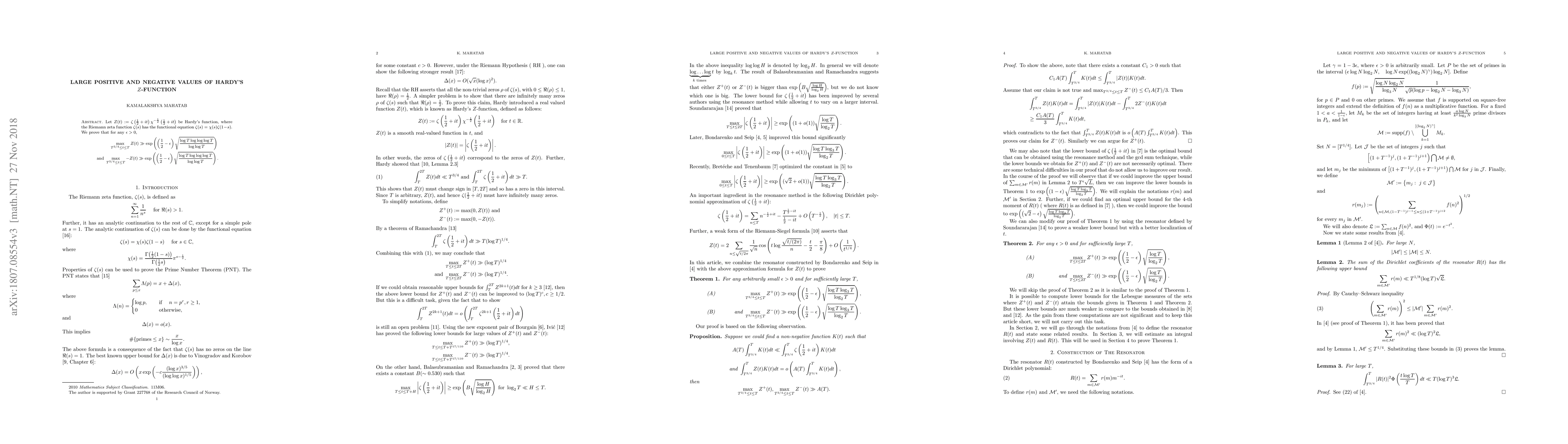 The paper proves that Hardy's Z-function has large positive and negative values, specifically growing exponentially with a certain rate, for a given range of t values, which sheds light on the distribution of prime numbers.