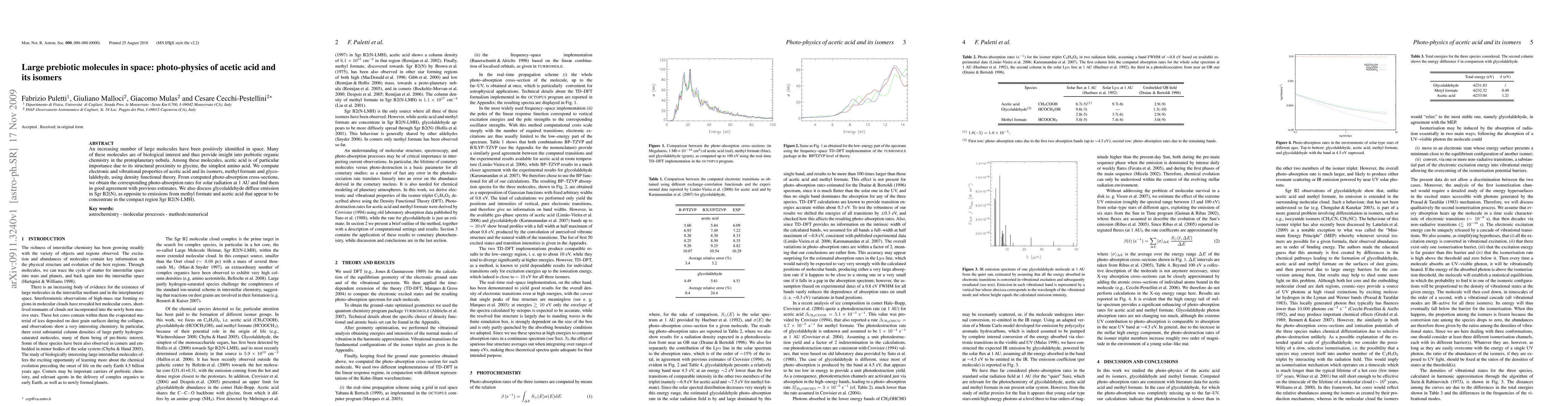 An increasing number of large molecules have been positively identified in space. Many of these molecules are of biological interest and thus provide insight into prebiotic organic chemistry in the protoplanetary nebula. Among these molecules, acetic acid is of particular importance due to its structural proximity to glycine, the simplest amino acid. We compute electronic and vibrational properties of acetic acid and its isomers, methyl formate and glycolaldehyde, using density functional theory. From computed photo-absorption cross-sections, we obtain the corresponding photo-absorption rates for solar radiation at 1 AU and find them in good agreement with previous estimates. We also discuss glycolaldehyde diffuse emission in Sgr B2(N), as opposite to emissions from methyl formate and acetic acid that appear to be concentrate in the compact region Sgr B2(N-LMH).