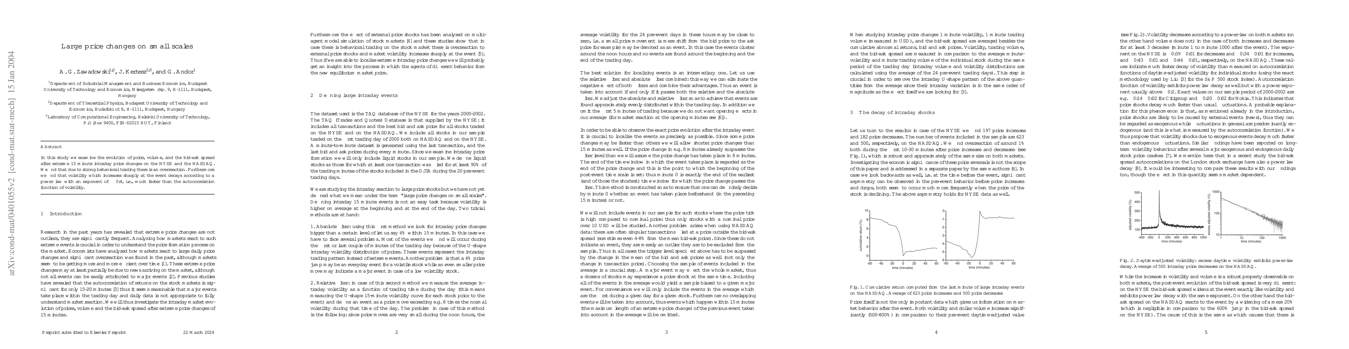 This study investigates the dynamics of price, volume, and bid-ask spread following extreme 15-minute intraday price changes on NYSE and NASDAQ, revealing strong behavioral trading-induced overreaction and volatility decay following a power law with an exponent of approximately 0.4.