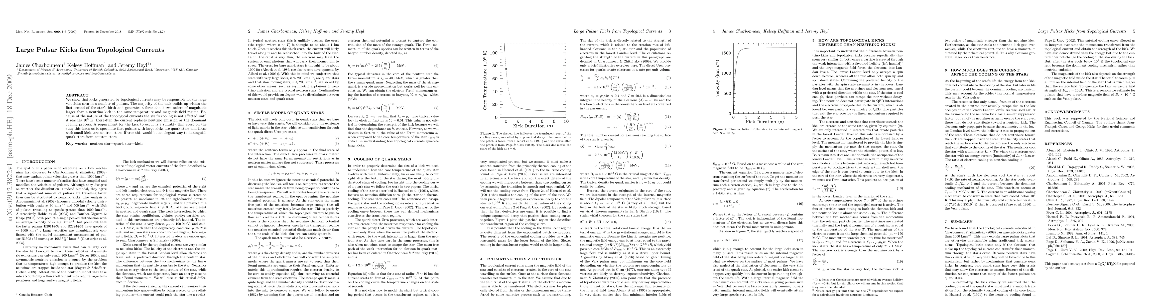 We show that kicks generated by topological currents may be responsible for the large velocities seen in a number of pulsars. The majority of the kick builds up within the first second of the star's birth and generates a force about two orders of magnitude larger than a neutrino kick in the same temperature and magnetic field regime. Because of the nature of the topological currents the star's cooling is not affected until it reaches 10^9 K; thereafter the current replaces neutrino emission as the dominant cooling process. A requirement for the kick to occur is a suitably thin crust on the star; this leads us to speculate that pulsars with large kicks are quark stars and those with small kicks are neutron stars. If true this would be an elegant way to distinguish quark stars from neutron stars.