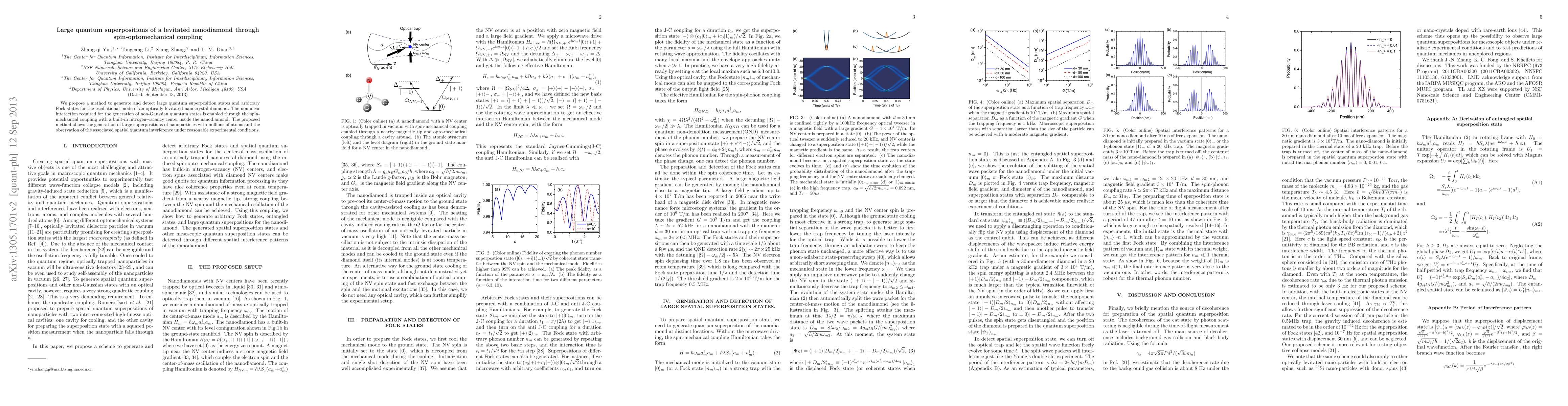 The paper presents a method to generate and detect large quantum superposition states and Fock states for an optically levitated nanodiamond using spin-mechanical coupling with a built-in NV center.