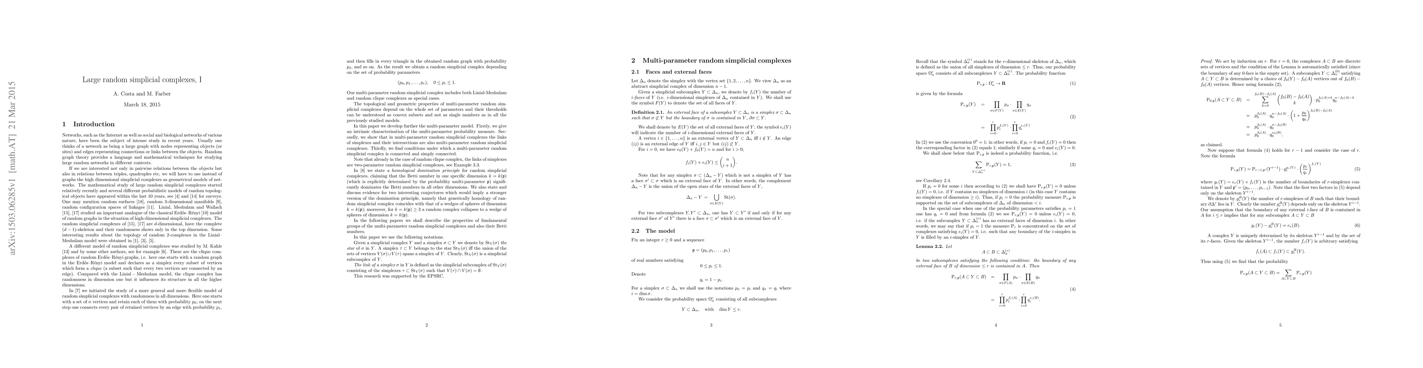 In this paper we develop further the multi-parameter model of random simplicial complexes. Firstly, we give an intrinsic characterisation of the multi-parameter probability measure. Secondly, we show that in multi-parameter random simplicial complexes the links of simplexes and their intersections are also multi-parameter random simplicial complexes. Thirdly, we find conditions under which a multi-parameter random simplicial complex is connected and simply connected.