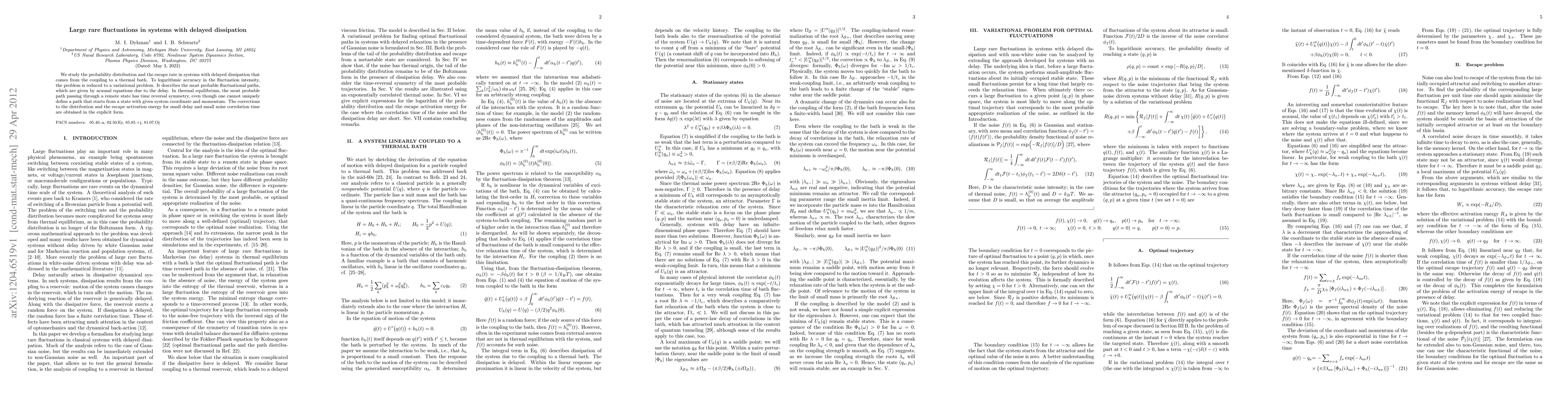 We study the probability distribution and the escape rate in systems with delayed dissipation that comes from the coupling to a thermal bath. To logarithmic accuracy in the fluctuation intensity, the problem is reduced to a variational problem. It describes the most probable fluctuational paths, which are given by acausal equations due to the delay. In thermal equilibrium, the most probable path passing through a remote state has time reversal symmetry, even though one cannot uniquely define a path that starts from a state with given system coordinate and momentum. The corrections to the distribution and the escape activation energy for small delay and small noise correlation time are obtained in the explicit form.