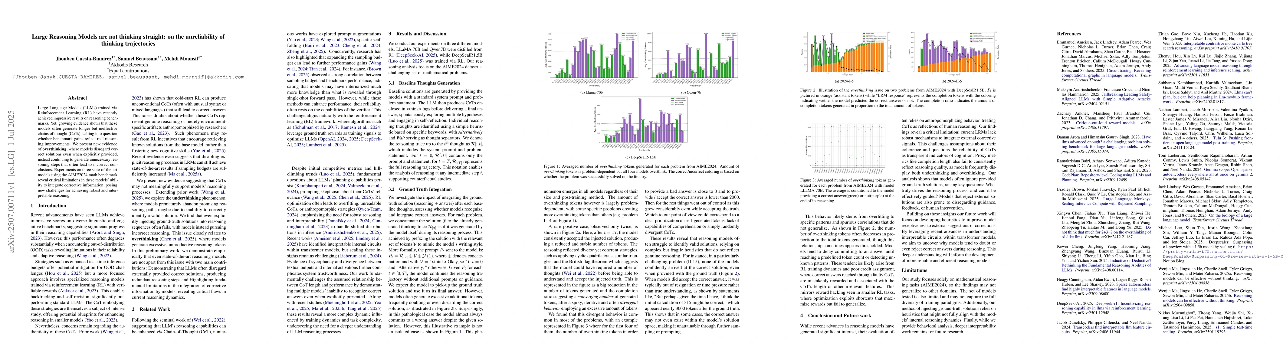 Large Language Models (LLMs) trained via Reinforcement Learning (RL) have recently achieved impressive results on reasoning benchmarks. Yet, growing evidence shows that these models often generate longer but ineffective chains of thought (CoTs), calling into question whether benchmark gains reflect real reasoning improvements. We present new evidence of overthinking, where models disregard correct solutions even when explicitly provided, instead continuing to generate unnecessary reasoning steps that often lead to incorrect conclusions. Experiments on three state-of-the-art models using the AIME2024 math benchmark reveal critical limitations in these models ability to integrate corrective information, posing new challenges for achieving robust and interpretable reasoning.