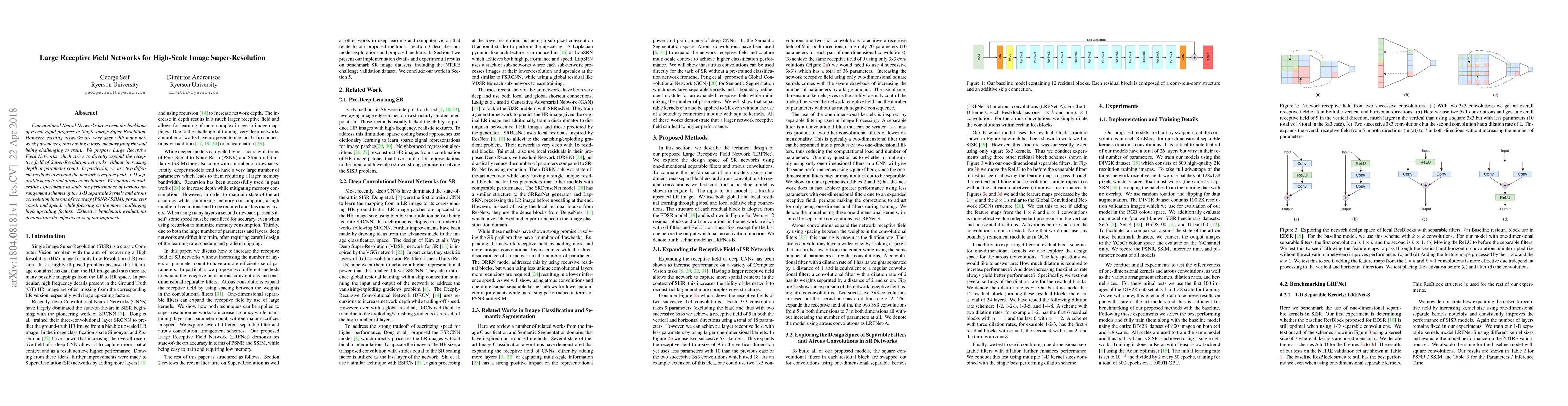 This paper proposes Large Receptive Field Networks for high-scale image super-resolution, aiming to enhance network performance without increasing depth or parameter count. The approach utilizes 1-D separable kernels and atrous convolutions to expand the receptive field, achieving better accuracy and efficiency for high upscaling factors.