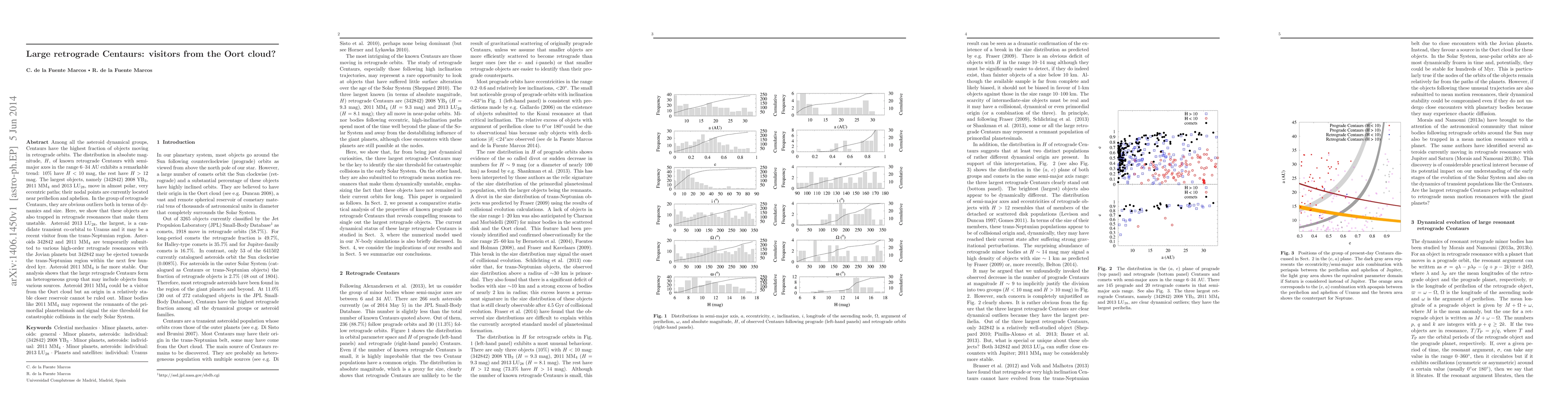 Among all the asteroid dynamical groups, Centaurs have the highest fraction of objects moving in retrograde orbits. The distribution in absolute magnitude, H, of known retrograde Centaurs with semi-major axes in the range 6-34 AU exhibits a remarkable trend: 10% have H < 10 mag, the rest have H > 12 mag. The largest objects, namely (342842) 2008 YB3, 2011 MM4 and 2013 LU28, move in almost polar, very eccentric paths; their nodal points are currently located near perihelion and aphelion. In the group of retrograde Centaurs, they are obvious outliers both in terms of dynamics and size. Here, we show that these objects are also trapped in retrograde resonances that make them unstable. Asteroid 2013 LU28, the largest, is a candidate transient co-orbital to Uranus and it may be a recent visitor from the trans-Neptunian region. Asteroids 342842 and 2011 MM4 are temporarily submitted to various high-order retrograde resonances with the Jovian planets but 342842 may be ejected towards the trans-Neptunian region within the next few hundred kyr. Asteroid 2011 MM4 is far more stable. Our analysis shows that the large retrograde Centaurs form an heterogeneous group that may include objects from various sources. Asteroid 2011 MM4 could be a visitor from the Oort cloud but an origin in a relatively stable closer reservoir cannot be ruled out. Minor bodies like 2011 MM4 may represent the remnants of the primordial planetesimals and signal the size threshold for catastrophic collisions in the early Solar System.