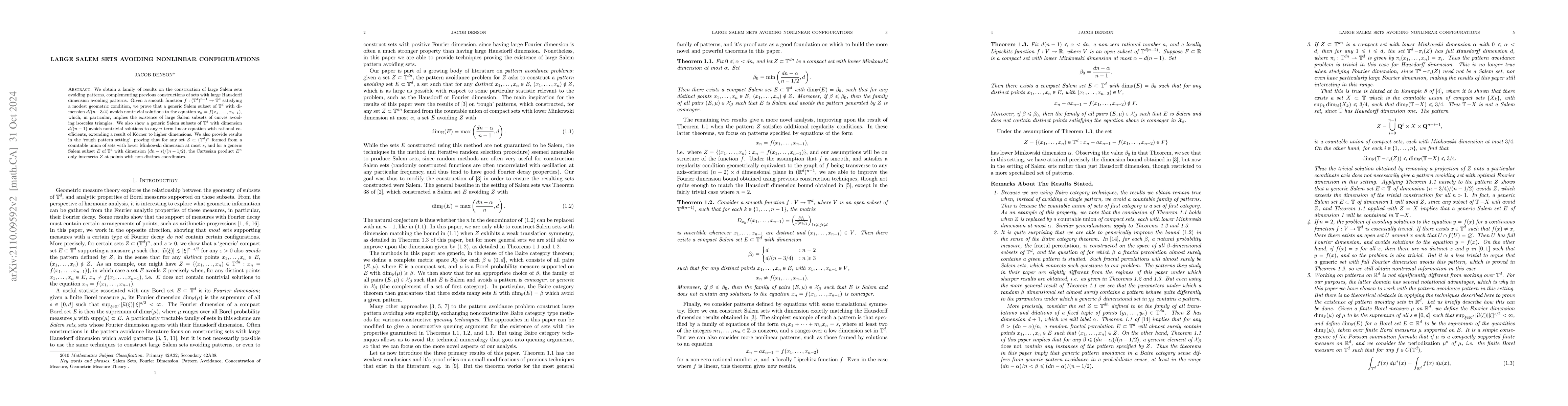 This paper constructs large Salem sets in $\mathbb{T}^d$ that avoid specific nonlinear configurations defined by families of Lipschitz or smooth functions. The sets achieve high Hausdorff dimensions while excluding solutions to given equations involving these functions.
