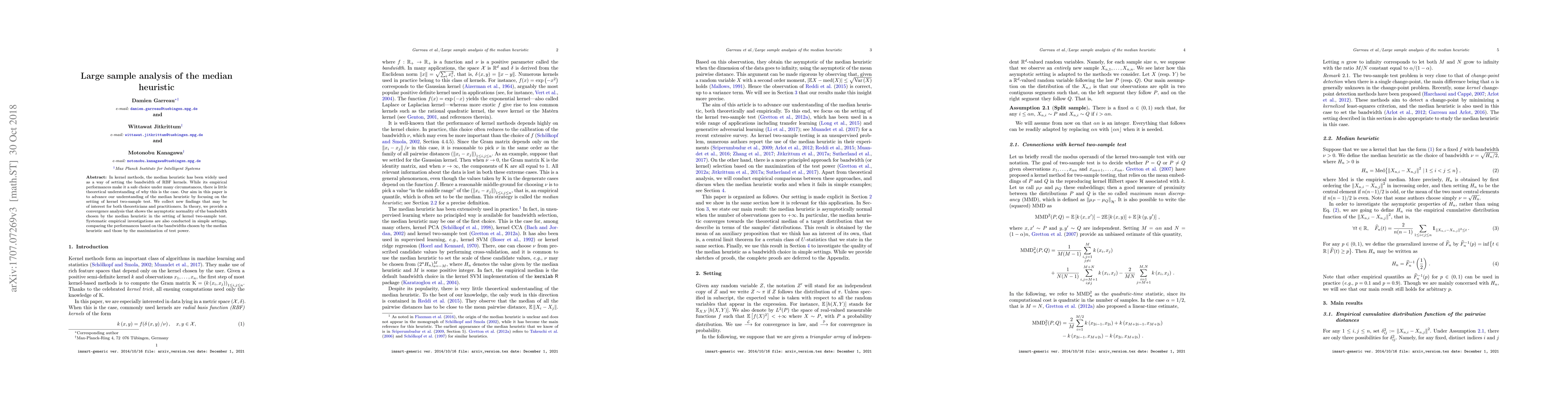 In kernel methods, the median heuristic has been widely used as a way of setting the bandwidth of RBF kernels. While its empirical performances make it a safe choice under many circumstances, there is little theoretical understanding of why this is the case. Our aim in this paper is to advance our understanding of the median heuristic by focusing on the setting of kernel two-sample test. We collect new findings that may be of interest for both theoreticians and practitioners. In theory, we provide a convergence analysis that shows the asymptotic normality of the bandwidth chosen by the median heuristic in the setting of kernel two-sample test. Systematic empirical investigations are also conducted in simple settings, comparing the performances based on the bandwidths chosen by the median heuristic and those by the maximization of test power.