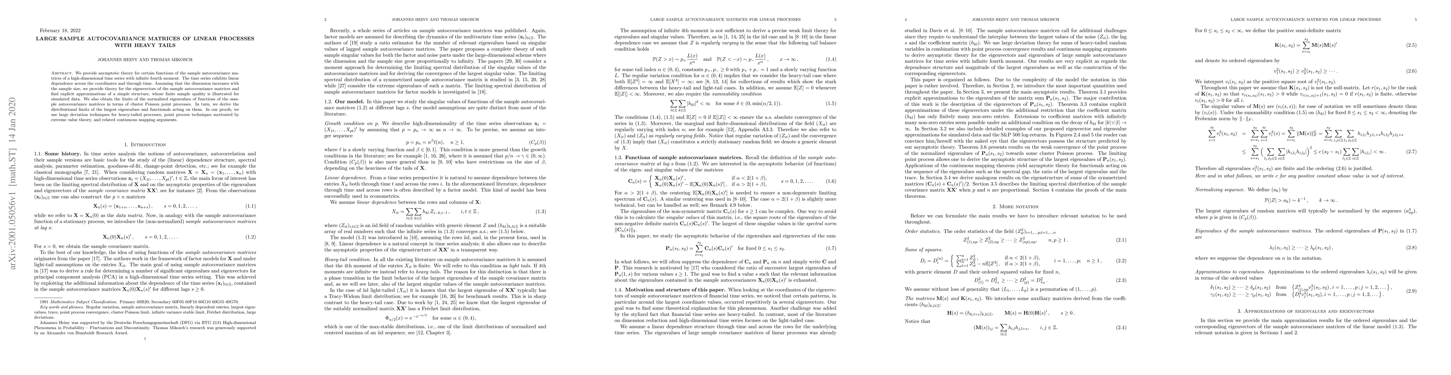 This paper develops asymptotic theory for the sample autocovariance matrices of high-dimensional time series with linear dependence and heavy tails, providing explicit approximations for their eigenvectors and limits for their eigenvalues in terms of cluster Poisson point processes. The results are demonstrated through simulated data and rigorous proofs utilizing large deviation and extreme value techniques.