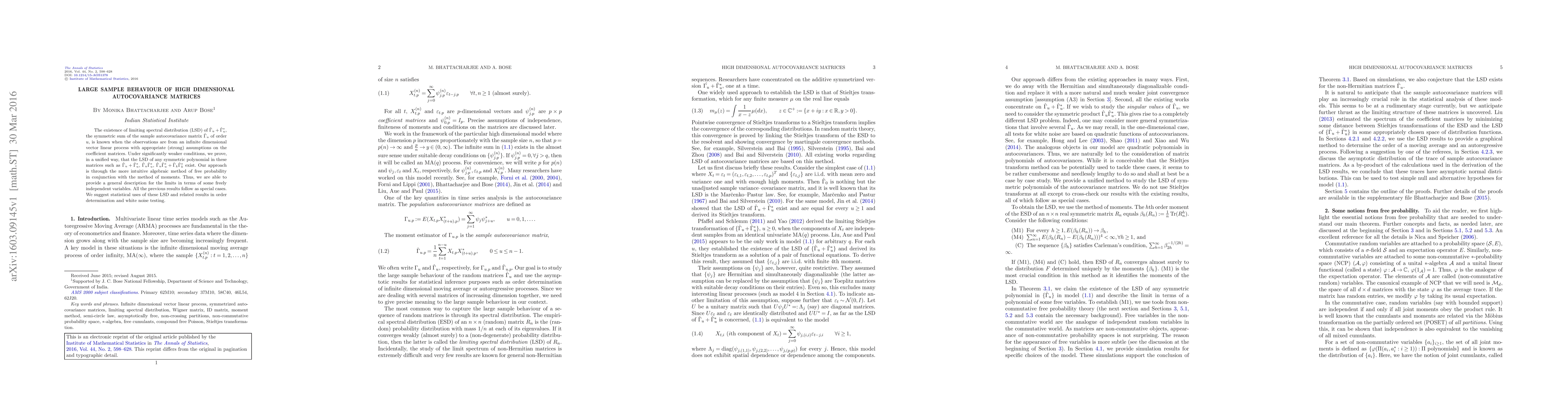 The existence of limiting spectral distribution (LSD) of $\hat{\Gamma}_u+\hat{\Gamma}_u^*$, the symmetric sum of the sample autocovariance matrix $\hat{\Gamma}_u$ of order $u$, is known when the observations are from an infinite dimensional vector linear process with appropriate (strong) assumptions on the coefficient matrices. Under significantly weaker conditions, we prove, in a unified way, that the LSD of any symmetric polynomial in these matrices such as $\hat{\Gamma}_u+\hat{\Gamma}_u^*$, $\hat{\Gamma}_u\hat{\Gamma}_u^*$, $\hat{\Gamma}_u\hat{\Gamma}_u^*+\hat{\Gamma}_k\hat{\Gamma}_k^*$ exist. Our approach is through the more intuitive algebraic method of free probability in conjunction with the method of moments. Thus, we are able to provide a general description for the limits in terms of some freely independent variables. All the previous results follow as special cases. We suggest statistical uses of these LSD and related results in order determination and white noise testing.