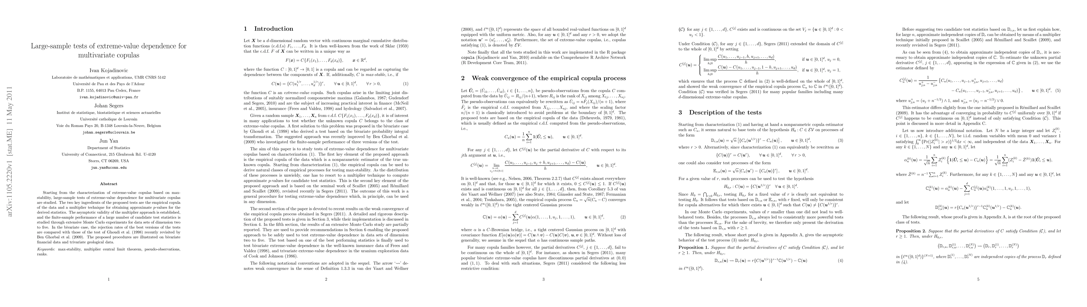 This paper develops large-sample tests for extreme-value dependence in multivariate copulas, utilizing empirical copulas and a multiplier technique for p-values. The tests' performance is validated through extensive Monte Carlo simulations and are applied to financial and geological datasets.