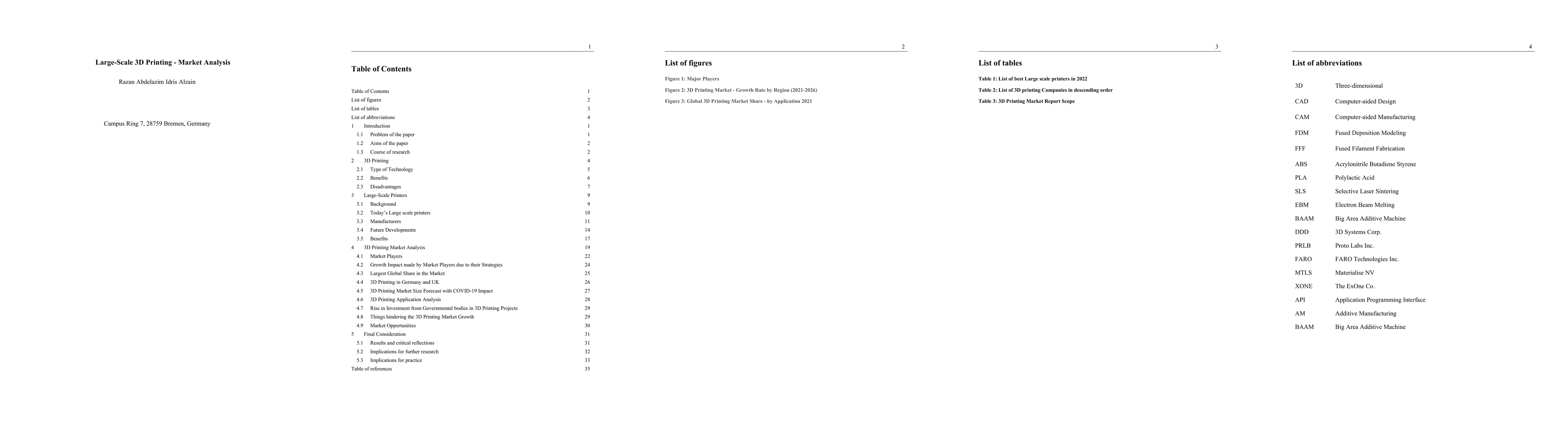 The aim of this research is to get a better understanding of the future of large-scale 3D printing. By developing the market analysis, it will be clear whether large-scale 3D printing is becoming more of a preferred way of printing custom-made parts for production companies. Companies can then choose whether to change their ways, for a more profitable less costly method, or stay on the route they are on. By getting deep into this topic, a new world of technology is then being discovered and familiarized. With a mix of theoretical and practical relevance, a complete coverage could be made on large-scale 3D printing. This paper could then cover all aspects of this topic, and the reader could then make their own judgment if large-scale 3D printing would be the best option.