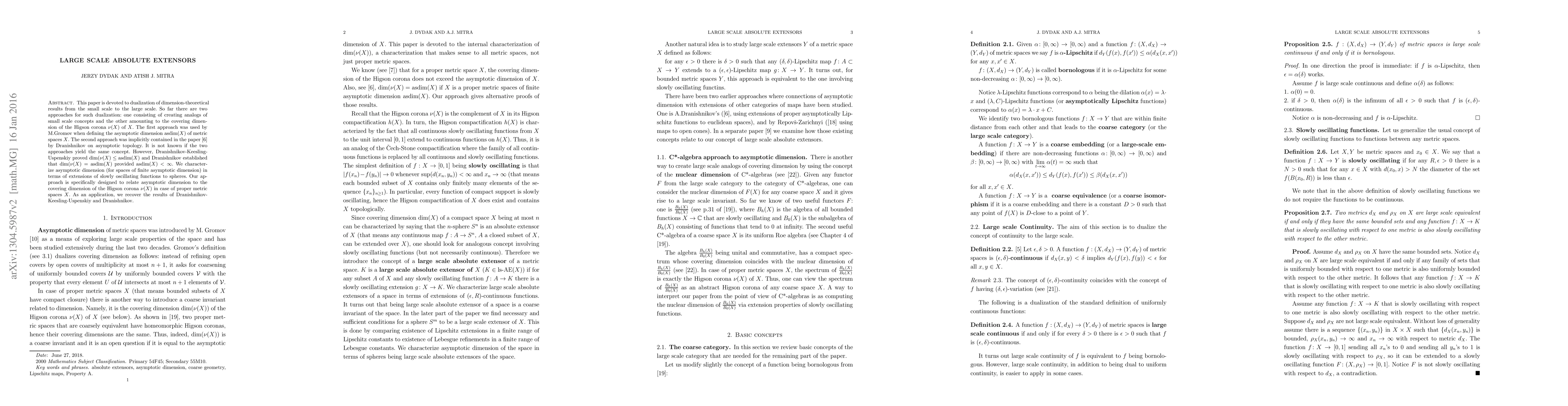 This paper is devoted to dualization of dimension-theoretical results from the small scale to the large scale. So far there are two approaches for such dualization: one consisting of creating analogs of small scale concepts and the other amounting to the covering dimension of the Higson corona $\nu(X)$ of $X$. The first approach was used by M.Gromov when defining the asymptotic dimension $\asdim(X)$ of metric spaces $X$. The second approach was implicitly contained in the paper \cite{Dran AsyTop} by Dranishnikov on asymptotic topology. It is not known if the two approaches yield the same concept. However, Dranishnikov-Keesling-Uspenskiy proved $\dim(\nu(X)\leq \asdim(X)$ and Dranishnikov established that $\dim(\nu(X)= \asdim(X)$ provided $\asdim(X) < \infty$. We characterize asymptotic dimension (for spaces of finite asymptotic dimension) in terms of extensions of slowly oscillating functions to spheres. Our approach is specifically designed to relate asymptotic dimension to the covering dimension of the Higson corona $\nu(X)$ in case of proper metric spaces $X$. As an application, we recover the results of Dranishnikov-Keesling-Uspenskiy and Dranishnikov.