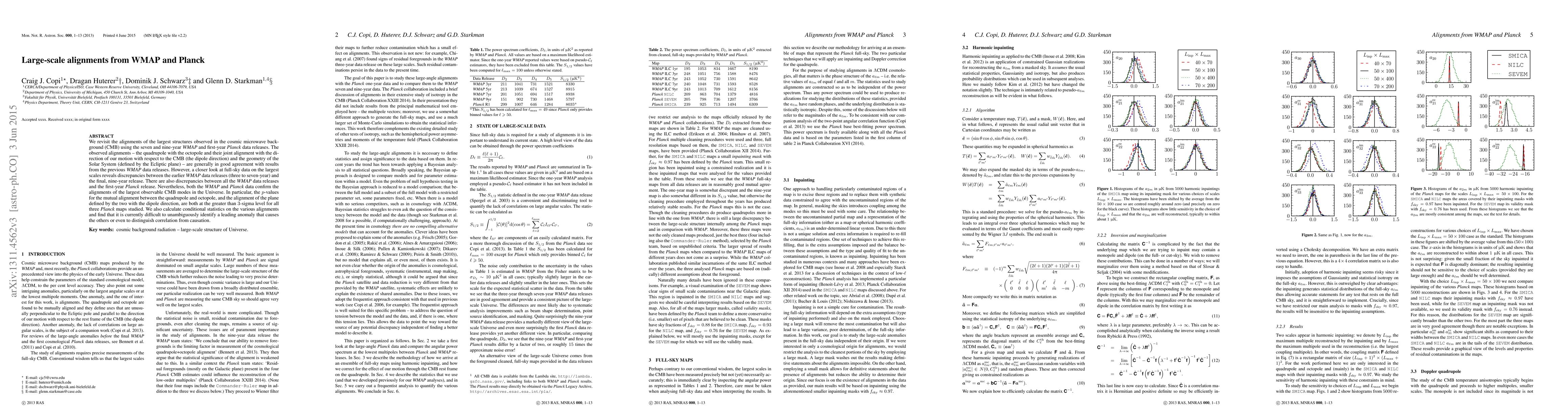 We revisit the alignments of the largest structures observed in the cosmic microwave background (CMB) using the seven and nine-year WMAP and first-year Planck data releases. The observed alignments -- the quadrupole with the octopole and their joint alignment with the direction of our motion with respect to the CMB (the dipole direction) and the geometry of the Solar System (defined by the Ecliptic plane) -- are generally in good agreement with results from the previous WMAP data releases. However, a closer look at full-sky data on the largest scales reveals discrepancies between the earlier WMAP data releases (three to seven-year) and the final nine-year release. There are also discrepancies between all the WMAP data releases and the first-year Planck release. Nevertheless, both the WMAP and Planck data confirm the alignments of the largest observable CMB modes in the Universe. In particular, the p-values for the mutual alignment between the quadrupole and octopole, and the alignment of the plane defined by the two with the dipole direction, are both at the greater than 3-sigma level for all three Planck maps studied. We also calculate conditional statistics on the various alignments and find that it is currently difficult to unambiguously identify a leading anomaly that causes the others or even to distinguish correlation from causation.