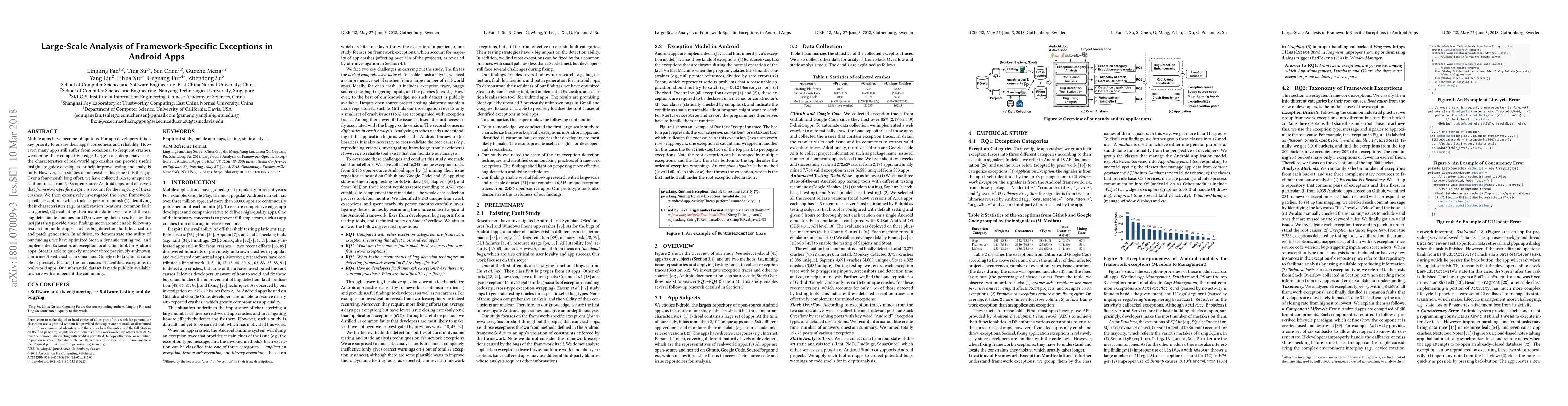 This paper conducts a large-scale analysis of framework-specific exceptions in Android apps, revealing that they account for the majority of crashes. The study identifies characteristics and fixes of 8,243 such exceptions, evaluates them with advanced bug detection tools, and optimizes testing and localization tools to uncover previously unknown crashes.