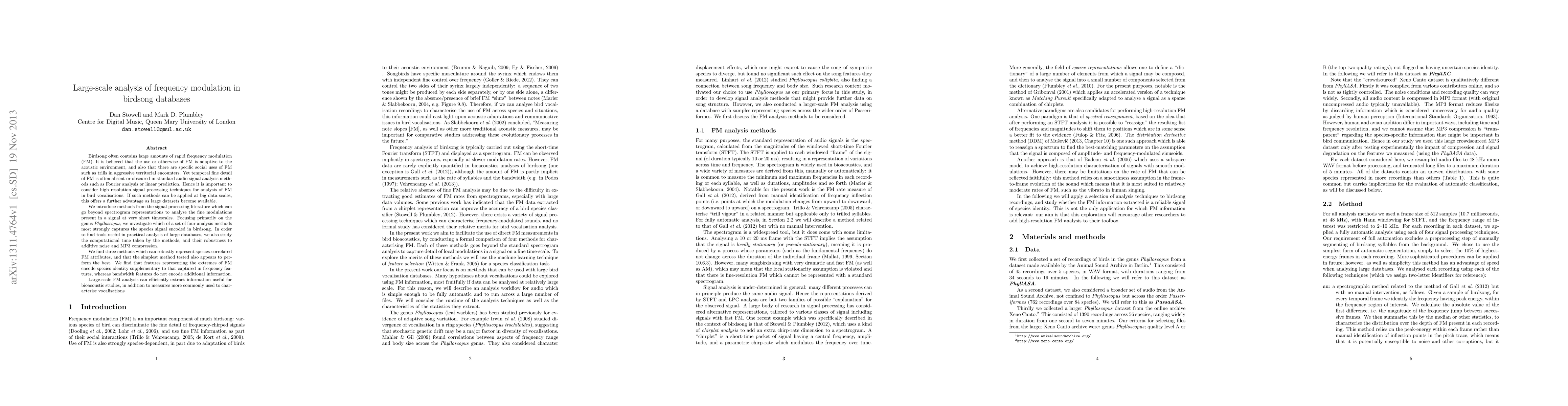 Birdsong often contains large amounts of rapid frequency modulation (FM). It is believed that the use or otherwise of FM is adaptive to the acoustic environment, and also that there are specific social uses of FM such as trills in aggressive territorial encounters. Yet temporal fine detail of FM is often absent or obscured in standard audio signal analysis methods such as Fourier analysis or linear prediction. Hence it is important to consider high resolution signal processing techniques for analysis of FM in bird vocalisations. If such methods can be applied at big data scales, this offers a further advantage as large datasets become available. We introduce methods from the signal processing literature which can go beyond spectrogram representations to analyse the fine modulations present in a signal at very short timescales. Focusing primarily on the genus Phylloscopus, we investigate which of a set of four analysis methods most strongly captures the species signal encoded in birdsong. In order to find tools useful in practical analysis of large databases, we also study the computational time taken by the methods, and their robustness to additive noise and MP3 compression. We find three methods which can robustly represent species-correlated FM attributes, and that the simplest method tested also appears to perform the best. We find that features representing the extremes of FM encode species identity supplementary to that captured in frequency features, whereas bandwidth features do not encode additional information. Large-scale FM analysis can efficiently extract information useful for bioacoustic studies, in addition to measures more commonly used to characterise vocalisations.