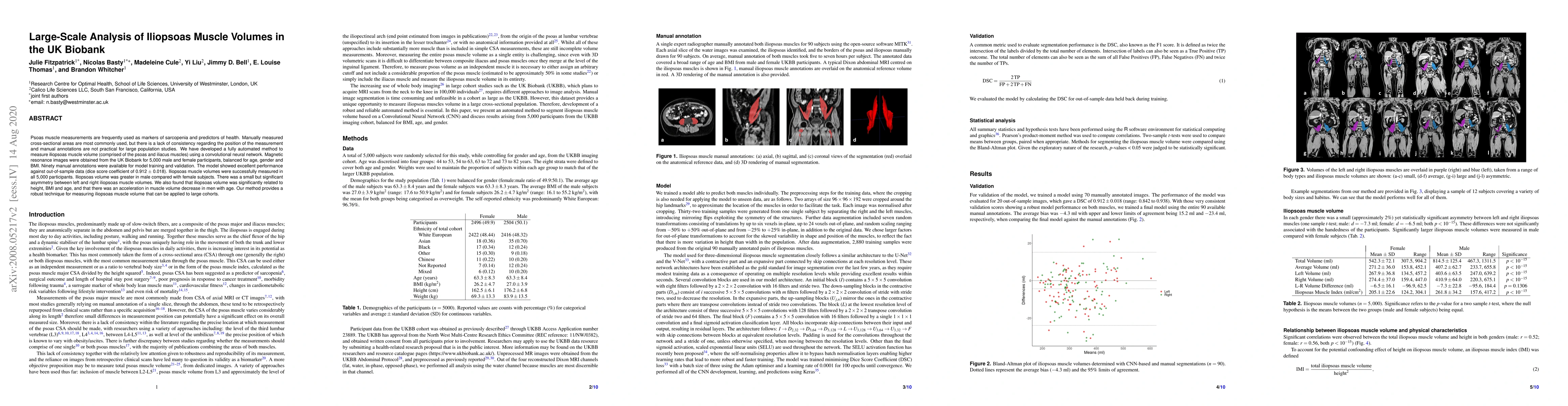 Psoas muscle measurements are frequently used as markers of sarcopenia and predictors of health. Manually measured cross-sectional areas are most commonly used, but there is a lack of consistency regarding the position of the measurementand manual annotations are not practical for large population studies. We have developed a fully automated method to measure iliopsoas muscle volume (comprised of the psoas and iliacus muscles) using a convolutional neural network. Magnetic resonance images were obtained from the UK Biobank for 5,000 male and female participants, balanced for age, gender and BMI. Ninety manual annotations were available for model training and validation. The model showed excellent performance against out-of-sample data (dice score coefficient of 0.912 +/- 0.018). Iliopsoas muscle volumes were successfully measured in all 5,000 participants. Iliopsoas volume was greater in male compared with female subjects. There was a small but significant asymmetry between left and right iliopsoas muscle volumes. We also found that iliopsoas volume was significantly related to height, BMI and age, and that there was an acceleration in muscle volume decrease in men with age. Our method provides a robust technique for measuring iliopsoas muscle volume that can be applied to large cohorts.