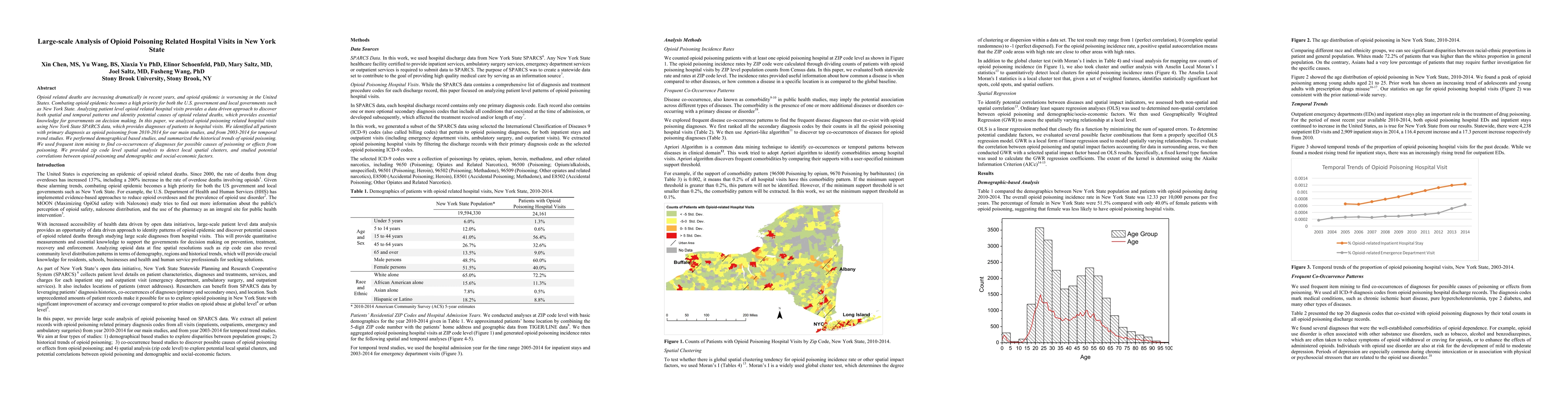 Opioid related deaths are increasing dramatically in recent years, and opioid epidemic is worsening in the United States. Combating opioid epidemic becomes a high priority for both the U.S. government and local governments such as New York State. Analyzing patient level opioid related hospital visits provides a data driven approach to discover both spatial and temporal patterns and identity potential causes of opioid related deaths, which provides essential knowledge for governments on decision making. In this paper, we analyzed opioid poisoning related hospital visits using New York State SPARCS data, which provides diagnoses of patients in hospital visits. We identified all patients with primary diagnosis as opioid poisoning from 2010-2014 for our main studies, and from 2003-2014 for temporal trend studies. We performed demographical based studies, and summarized the historical trends of opioid poisoning. We used frequent item mining to find co-occurrences of diagnoses for possible causes of poisoning or effects from poisoning. We provided zip code level spatial analysis to detect local spatial clusters, and studied potential correlations between opioid poisoning and demographic and social-economic factors.