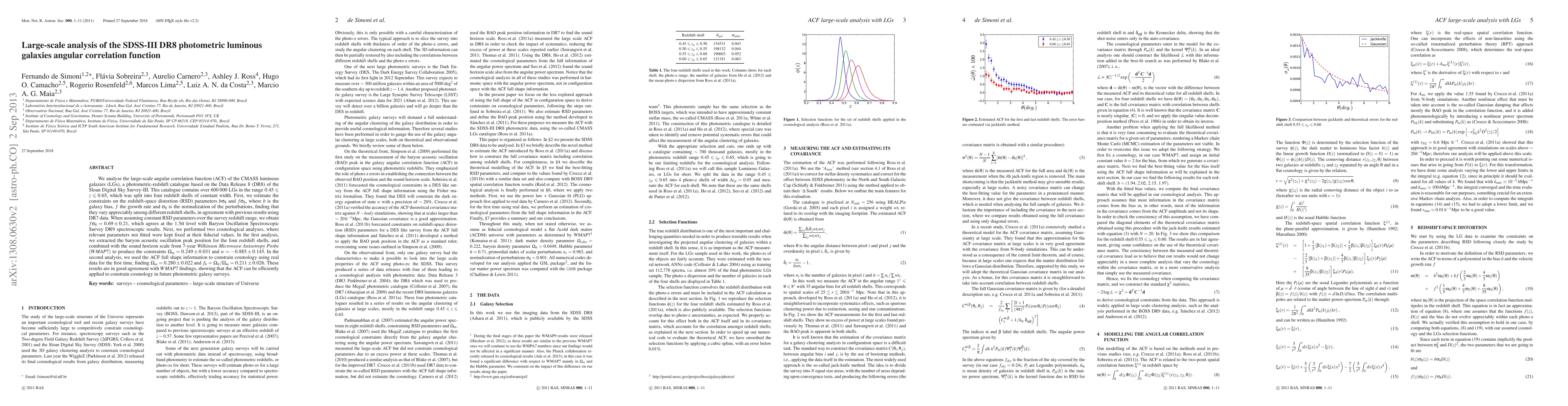 We analyse the large-scale angular correlation function (ACF) of the CMASS luminous galaxies (LGs), a photometric-redshift catalogue based on the Data Release 8 (DR8) of the Sloan Digital Sky Survey-III. This catalogue contains over $600 \, \, 000$ LGs in the range $0.45 \leq z \leq 0.65$, which was split into four redshift shells of constant width. First, we estimate the constraints on the redshift-space distortion (RSD) parameters $b\sigma_8$ and $f\sigma_8$, where $b$ is the galaxy bias, $f$ the growth rate and $\sigma_8$ is the normalization of the perturbations, finding that they vary appreciably among different redshift shells, in agreement with previous results using DR7 data. When assuming constant RSD parameters over the survey redshift range, we obtain $f\sigma_8 = 0.69 \pm 0.21$, which agrees at the $1.5\sigma$ level with Baryon Oscillation Spectroscopic Survey DR9 spectroscopic results. Next, we performed two cosmological analyses, where relevant parameters not fitted were kept fixed at their fiducial values. In the first analysis, we extracted the baryon acoustic oscillation peak position for the four redshift shells, and combined with the sound horizon scale from 7-year \textit{Wilkinson Microwave Anisotropy Probe} $(WMAP7)$ to produce the constraints $\Omega_{m}=0.249 \pm 0.031$ and $w=-0.885 \pm 0.145$. In the second analysis, we used the ACF full shape information to constrain cosmology using real data for the first time, finding $\Omega_{m} = 0.280 \pm 0.022$ and $f_b = \Omega_b/\Omega_m = 0.211 \pm 0.026$. These results are in good agreement with $WMAP7$ findings, showing that the ACF can be efficiently applied to constrain cosmology in future photometric galaxy surveys.