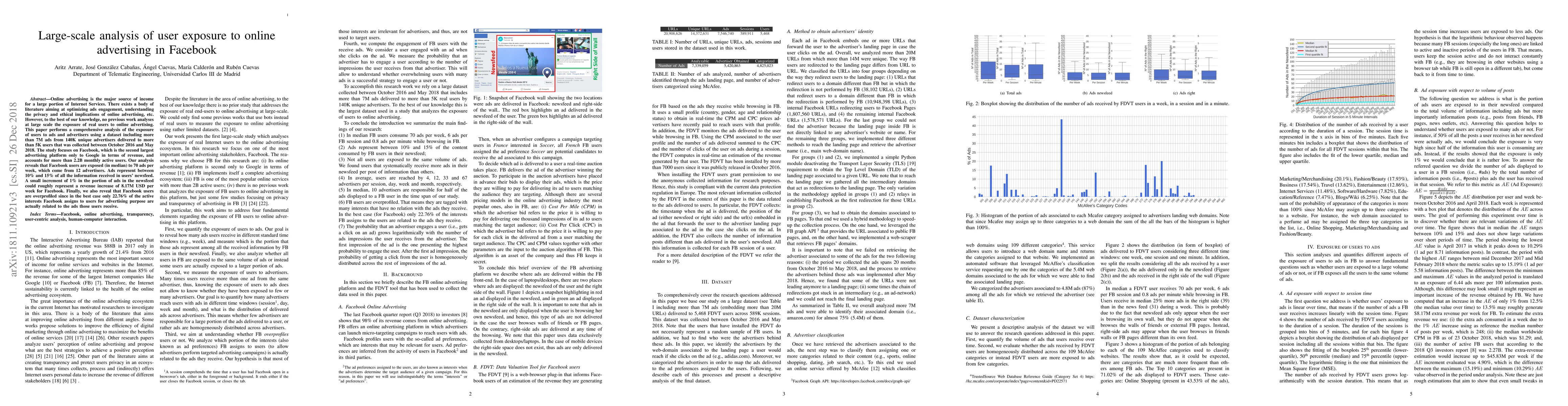 This paper conducts a large-scale analysis of user exposure to online advertising on Facebook, revealing that users are exposed to 70 ads per week on average, with ads comprising 10-15% of their newsfeed content. The study highlights significant overprofiling and suggests a small increase in ad presence could substantially boost Facebook's revenue.