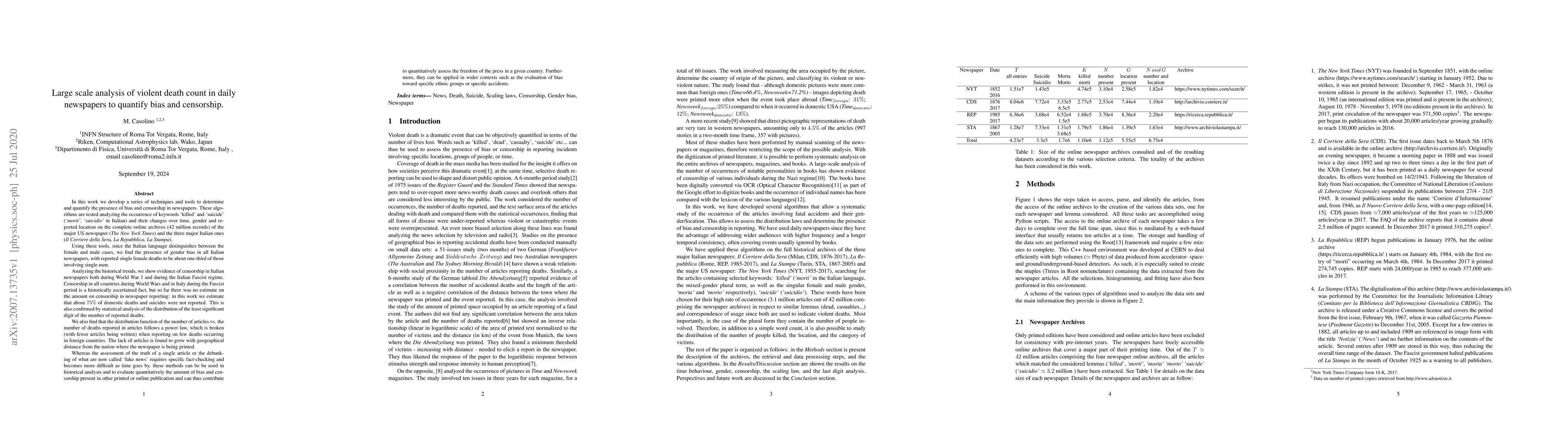 This research analyzes 42 million newspaper records from major US and Italian newspapers to quantify bias and censorship. It finds gender bias in Italian newspapers, with fewer reports on single female deaths. Evidence of censorship is noted during World War 1, the Italian Fascist regime, and World Wars, estimating 75% domestic deaths and suicides went unreported. The study also discovers a power-law distribution in articles vs. reported deaths, broken for foreign deaths, with fewer articles for distant foreign events.