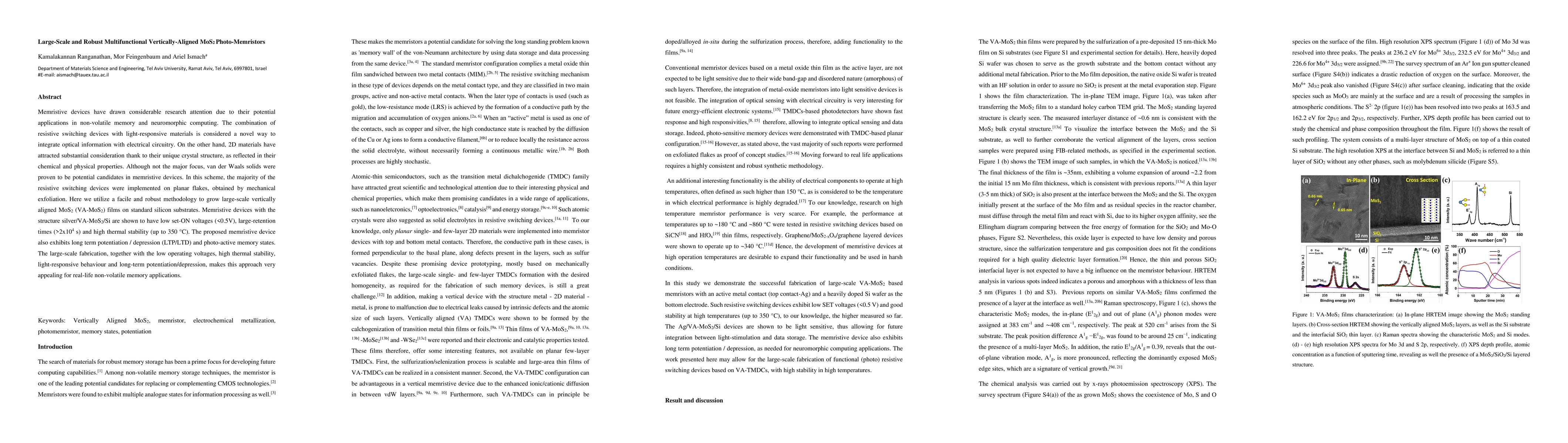 This paper presents a method for growing large-scale vertically aligned MoS$_2$ (VA-MoS$_2$) films that serve as photo-memristors, demonstrating low operating voltages, high thermal stability, and light-responsive properties, making them suitable for non-volatile memory applications. The memristive devices exhibit long-term potentiation/depression and large retention times, enhancing their potential in neuromorphic computing.