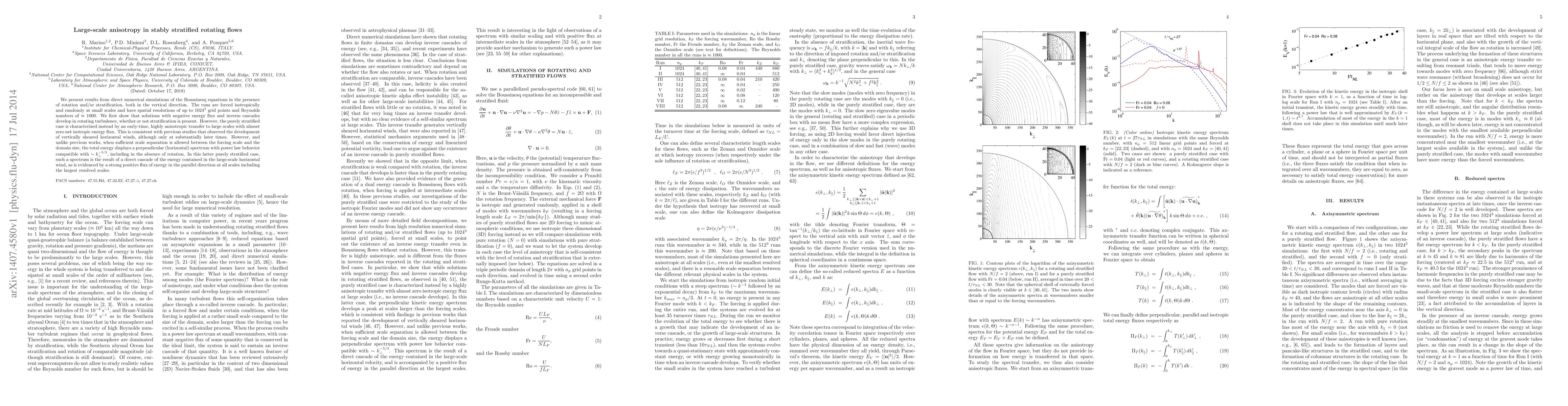 This study uses direct numerical simulations to explore large-scale anisotropy in stably stratified rotating flows, revealing that inverse cascades and anisotropic energy transfer occur in rotating turbulence, while purely stratified flows exhibit a perpendicular power law spectrum and a direct cascade of energy in the horizontal direction.