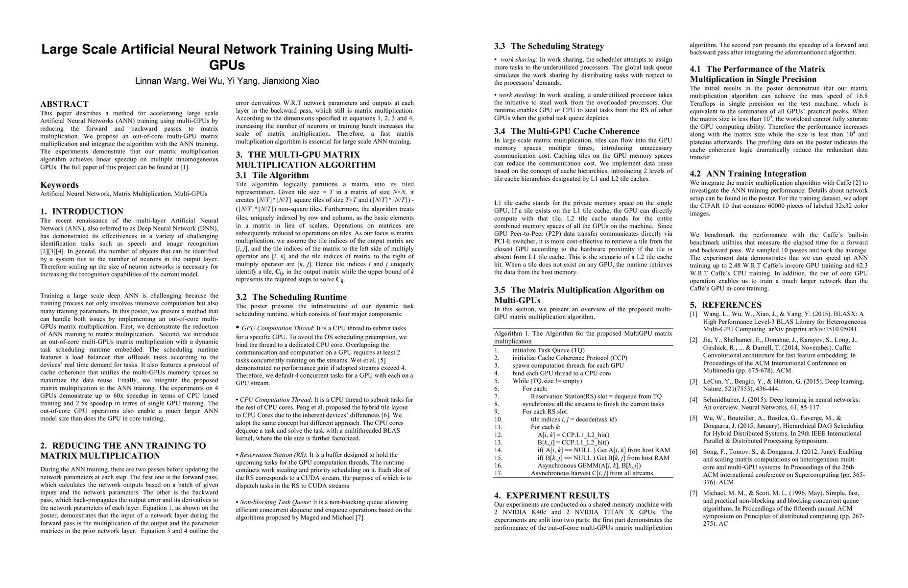 This paper describes a method for accelerating large scale Artificial Neural Networks (ANN) training using multi-GPUs by reducing the forward and backward passes to matrix multiplication. We propose an out-of-core multi-GPU matrix multiplication and integrate the algorithm with the ANN training. The experiments demonstrate that our matrix multiplication algorithm achieves linear speedup on multiple inhomogeneous GPUs. The full paper of this project can be found at [1].