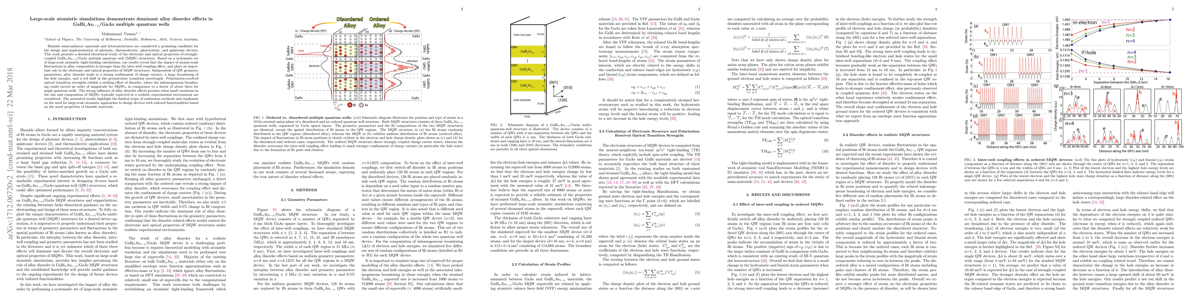 This study uses large-scale atomistic simulations to show that alloy disorder in GaBi$_x$As$_{1-x}$/GaAs multiple quantum wells has a dominant effect on electronic and optical properties, leading to strong charge carrier confinement and significant broadening of hole energies. The findings underscore the importance of atomistic approaches over continuum methods for device design based on bismide materials.