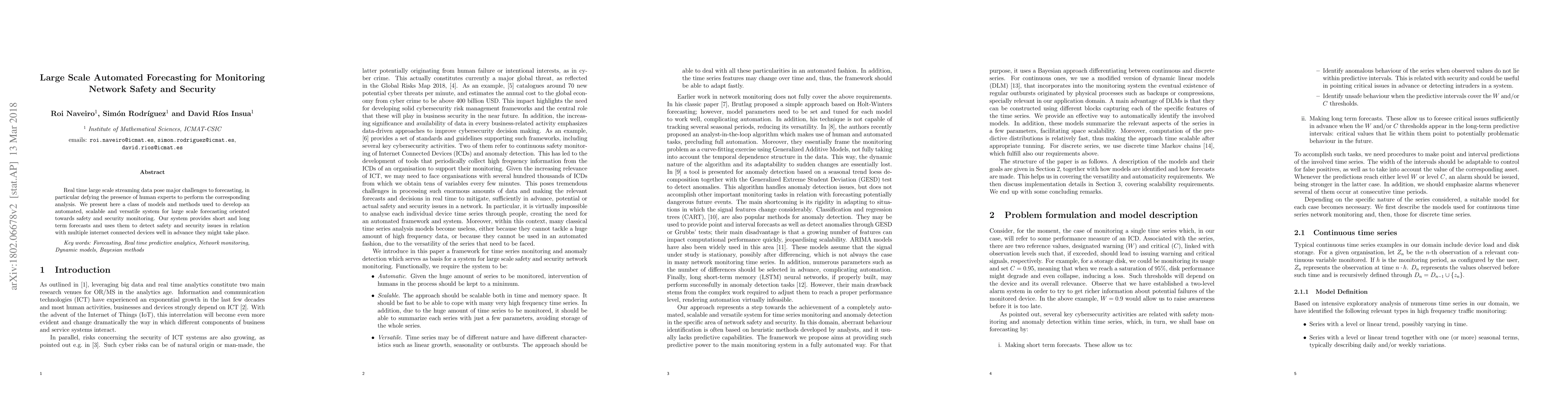 Real time large scale streaming data pose major challenges to forecasting, in particular defying the presence of human experts to perform the corresponding analysis. We present here a class of models and methods used to develop an automated, scalable and versatile system for large scale forecasting oriented towards safety and security monitoring. Our system provides short and long term forecasts and uses them to detect safety and security issues in relation with multiple internet connected devices well in advance they might take place.
