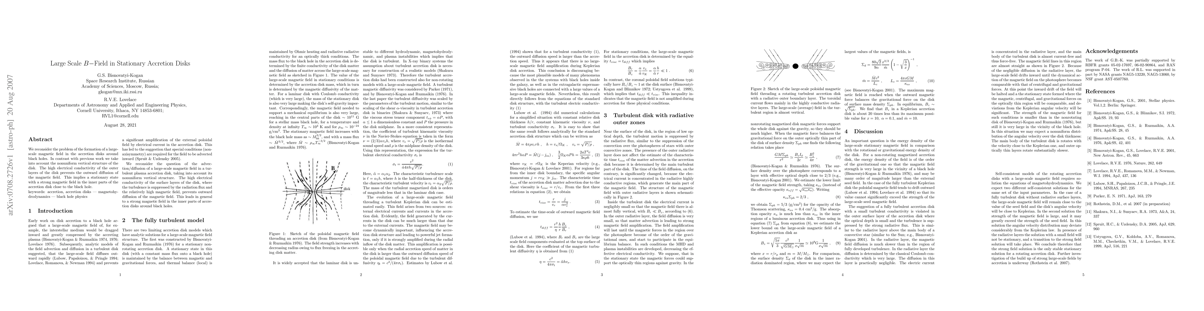 This paper explores the formation of large-scale magnetic fields in black hole accretion disks, emphasizing the nonuniform vertical structure. It concludes that high conductivity in outer disk layers inhibits magnetic field diffusion, leading to a strong stationary magnetic field in the inner disk regions near the black hole.