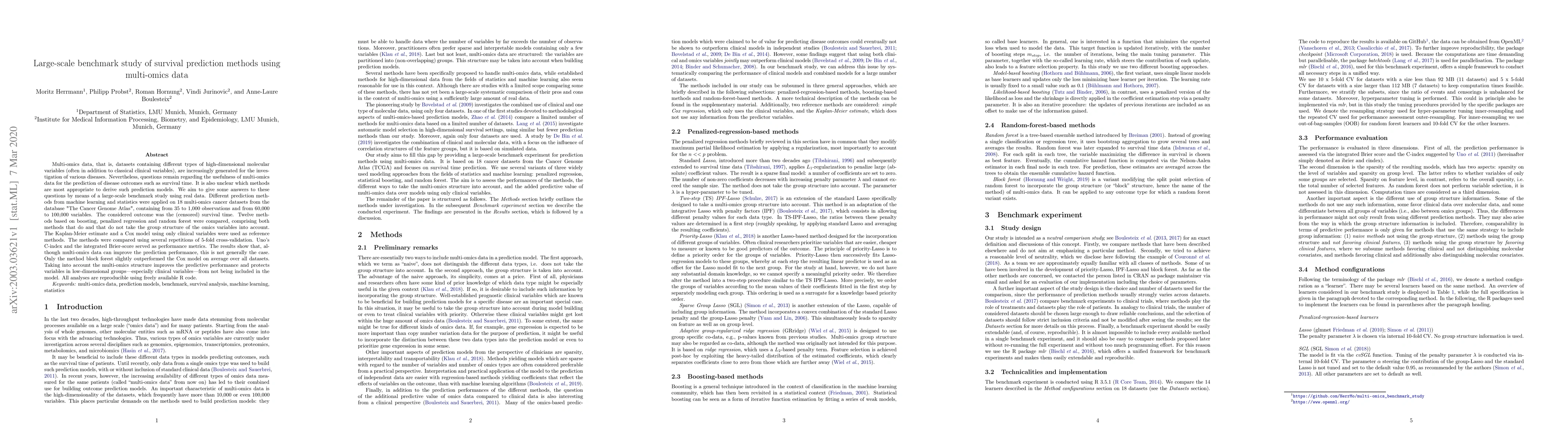 This study benchmarks various machine learning and statistical methods for predicting survival using multi-omics data from cancer patients. Results indicate that while multi-omics data can enhance prediction, only the block forest method outperformed traditional Cox models, and accounting for omics structure generally improves performance.