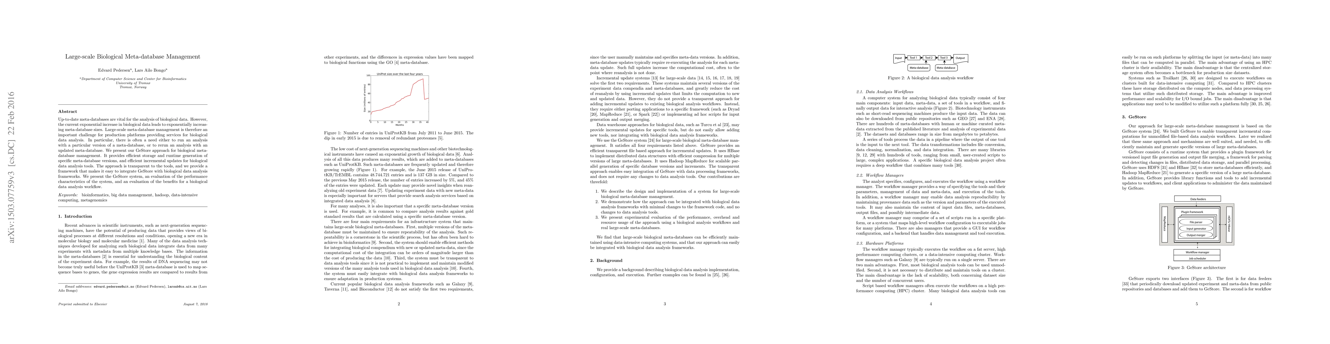 The paper introduces GeStore, an approach for managing large-scale biological meta-databases, addressing the challenge of exponentially growing data sizes. GeStore enables efficient storage and generation of specific meta-database versions, along with incremental updates, facilitating seamless integration with biological data analysis tools.