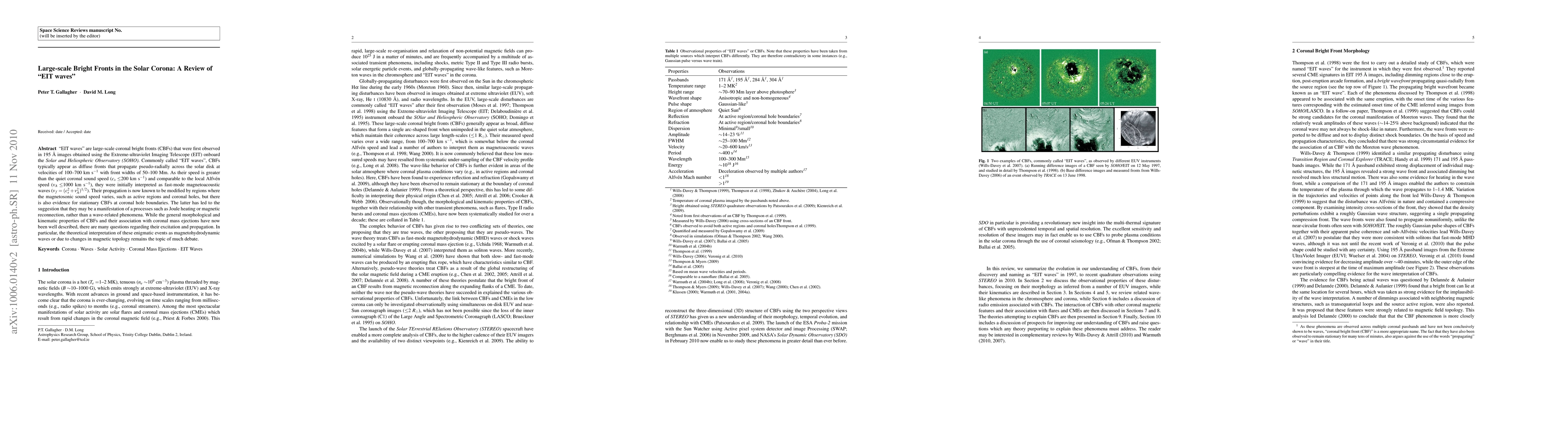 Large-scale coronal bright fronts (CBFs), known as EIT waves, are diffuse fronts that propagate across the solar disk at high speeds, with properties currently debated among scientists about their excitation and propagation mechanisms.