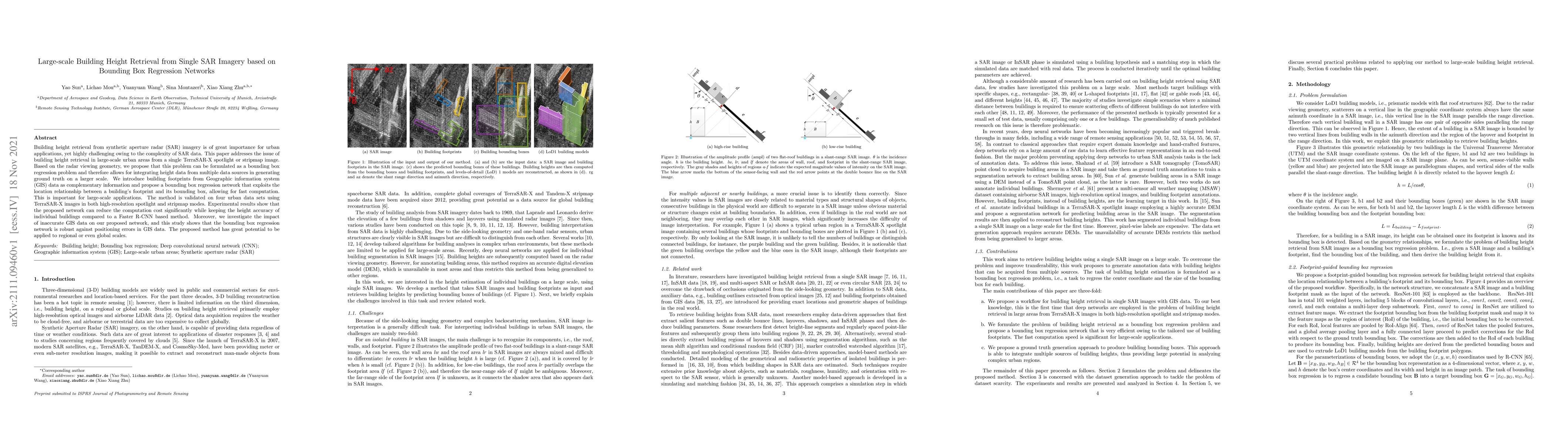 Building height retrieval from synthetic aperture radar (SAR) imagery is of great importance for urban applications, yet highly challenging owing to the complexity of SAR data. This paper addresses the issue of building height retrieval in large-scale urban areas from a single TerraSAR-X spotlight or stripmap image. Based on the radar viewing geometry, we propose that this problem can be formulated as a bounding box regression problem and therefore allows for integrating height data from multiple data sources in generating ground truth on a larger scale. We introduce building footprints from geographic information system (GIS) data as complementary information and propose a bounding box regression network that exploits the location relationship between a building's footprint and its bounding box, allowing for fast computation. This is important for large-scale applications. The method is validated on four urban data sets using TerraSAR-X images in both high-resolution spotlight and stripmap modes. Experimental results show that the proposed network can reduce the computation cost significantly while keeping the height accuracy of individual buildings compared to a Faster R-CNN based method. Moreover, we investigate the impact of inaccurate GIS data on our proposed network, and this study shows that the bounding box regression network is robust against positioning errors in GIS data. The proposed method has great potential to be applied to regional or even global scales.