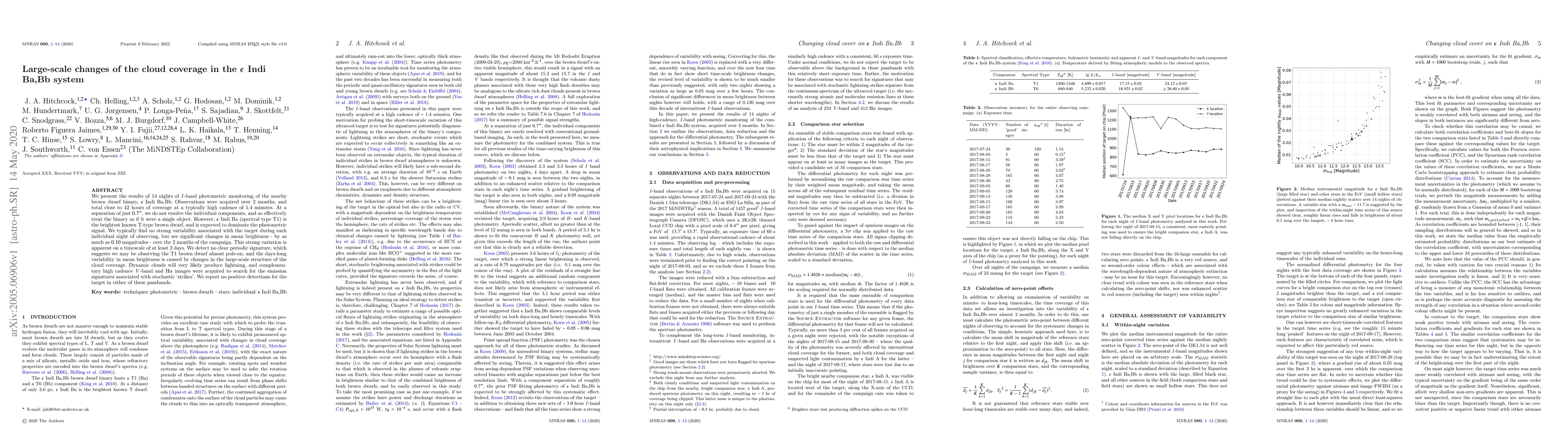 We present the results of 14 nights of \textit{I}-band photometric monitoring of the nearby brown dwarf binary, $\epsilon$ Indi Ba,Bb. Observations were acquired over 2 months, and total close to 42 hours of coverage at a typically high cadence of 1.4 minutes. At a separation of just $0.7''$, we do not resolve the individual components, and so effectively treat the binary as if it were a single object. However, $\epsilon$ Indi Ba (spectral type T1) is the brightest known T-type brown dwarf, and is expected to dominate the photometric signal. We typically find no strong variability associated with the target during each individual night of observing, but see significant changes in mean brightness - by as much as $0.10$ magnitudes - over the 2 months of the campaign. This strong variation is apparent on a timescale of at least 2 days. We detect no clear periodic signature, which suggests we may be observing the T1 brown dwarf almost pole-on, and the days-long variability in mean brightness is caused by changes in the large-scale structure of the cloud coverage. Dynamic clouds will very likely produce lightning, and complementary high cadence \textit{V}-band and H\textit{$\alpha$} images were acquired to search for the emission signatures associated with stochastic "strikes." We report no positive detections for the target in either of these passbands.
