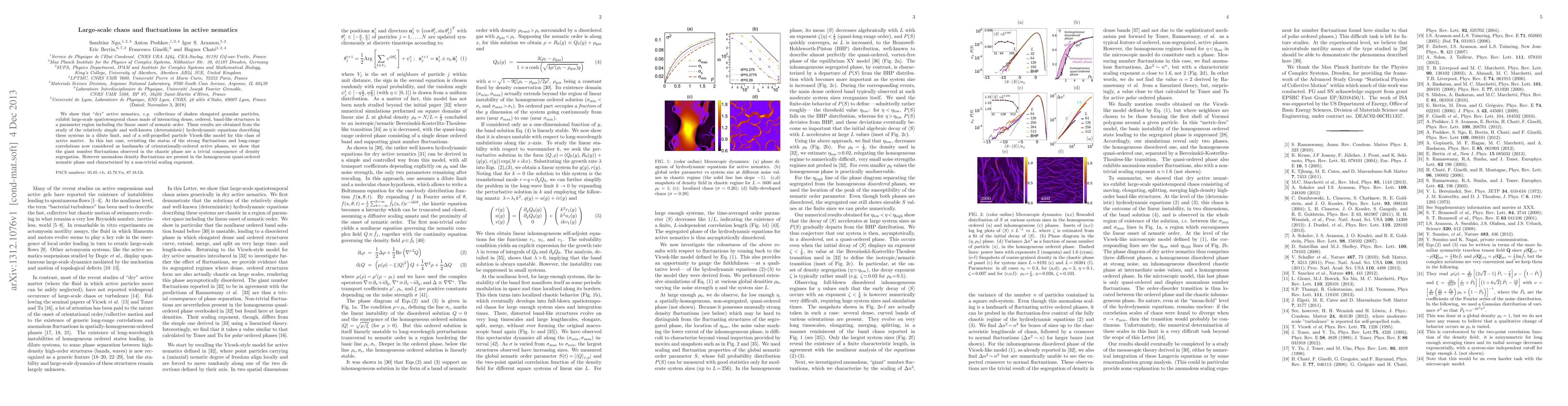 We show that "dry" active nematics, e.g. collections of shaken elongated granular particles, exhibit large-scale spatiotemporal chaos made of interacting dense, ordered, band-like structures in a parameter region including the linear onset of nematic order. These results are obtained from the study of the relatively simple and well-known (deterministic) hydrodynamic equations describing these systems in a dilute limit, and of a self-propelled particle Vicsek-like model for this class of active matter. In this last case, revisiting the status of the strong fluctuations and long-range correlations now considered as landmarks of orientationally-ordered active phases, we show that the giant number fluctuations observed in the chaotic phase are a trivial consequence of density segregation. However anomalous density fluctuations are present in the homogeneous quasi-ordered nematic phase and characterized by a non-trivial scaling exponent.