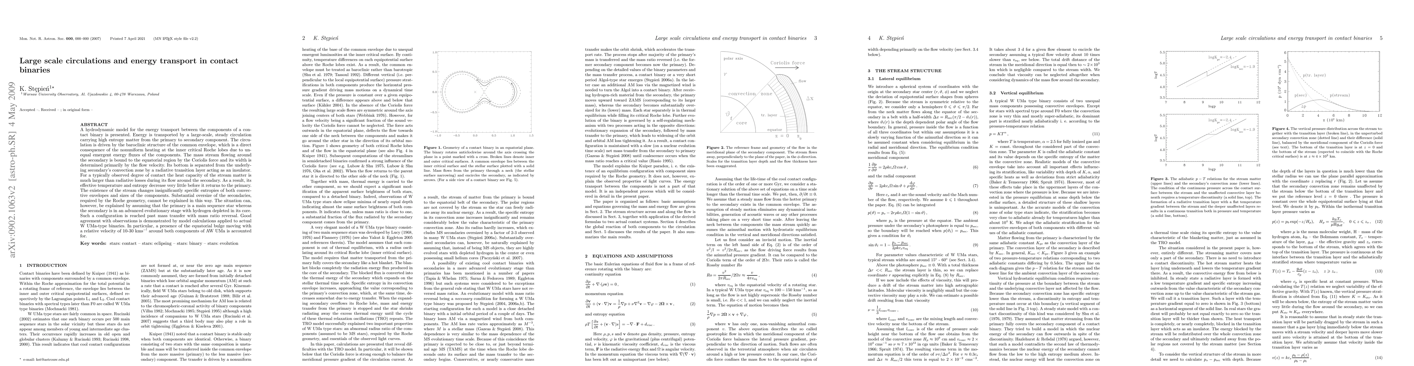 A hydrodynamic model for the energy transport between the components of a contact binary is presented. Energy is transported by a large-scale, steady circulation carrying high entropy matter from the primary to secondary component. The circulation is driven by the baroclinic structure of the common envelope, which is a direct consequence of the nonuniform heating at the inner critical Roche lobes due to unequal emergent energy fluxes of the components. The mass stream flowing around the secondary is bound to the equatorial region by the Coriolis force and its width is determined primarily by the flow velocity. Its bottom is separated from the underlying secondary's convection zone by a radiative transition layer acting as an insulator. For a typically observed degree of contact the heat capacity of the stream matter is much larger than radiative losses during its flow around the secondary. As a result, its effective temperature and entropy decrease very little before it returns to the primary. The existence of the stream changes insignificantly specific entropies of both convective envelopes and sizes of the components. Substantial oversize of the secondaries, required by the Roche geometry, cannot be explained in this way. The situation can, however, be explained by assuming that the primary is a main sequence star whereas the secondary is in an advanced evolutionary stage with hydrogen depleted in its core. Such a configuration is reached past mass transfer with mass ratio reversal. Good agreement with observations is demonstrated by model calculations applied to actual W UMa-type binaries. In particular, a presence of the equatorial bulge moving with a relative velocity of 10-30 km/s around both components of AW UMa is accounted for.