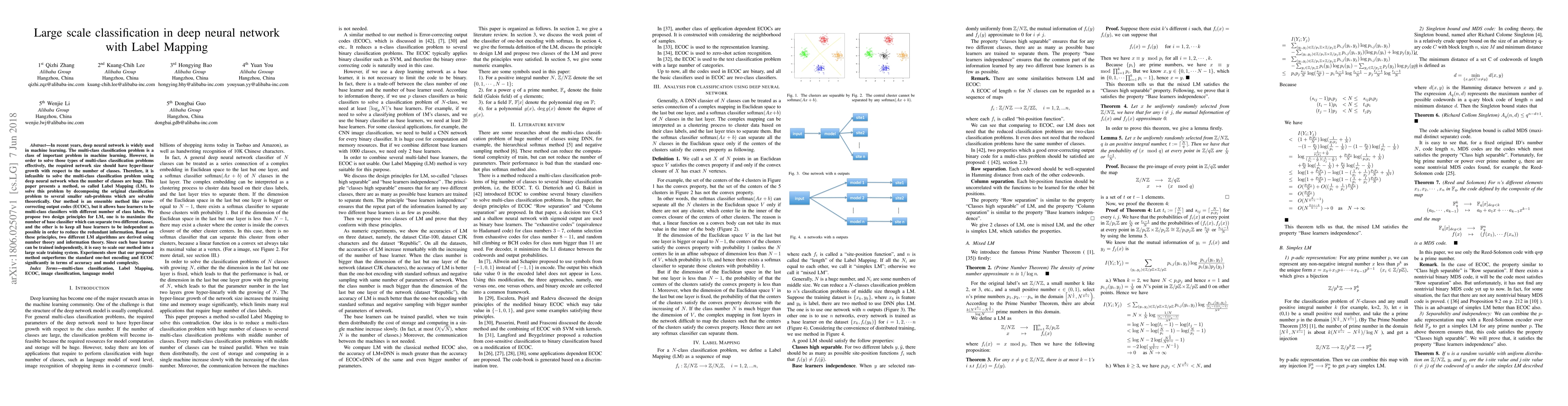 In recent years, deep neural network is widely used in machine learning. The multi-class classification problem is a class of important problem in machine learning. However, in order to solve those types of multi-class classification problems effectively, the required network size should have hyper-linear growth with respect to the number of classes. Therefore, it is infeasible to solve the multi-class classification problem using deep neural network when the number of classes are huge. This paper presents a method, so called Label Mapping (LM), to solve this problem by decomposing the original classification problem to several smaller sub-problems which are solvable theoretically. Our method is an ensemble method like error-correcting output codes (ECOC), but it allows base learners to be multi-class classifiers with different number of class labels. We propose two design principles for LM, one is to maximize the number of base classifier which can separate two different classes, and the other is to keep all base learners to be independent as possible in order to reduce the redundant information. Based on these principles, two different LM algorithms are derived using number theory and information theory. Since each base learner can be trained independently, it is easy to scale our method into a large scale training system. Experiments show that our proposed method outperforms the standard one-hot encoding and ECOC significantly in terms of accuracy and model complexity.