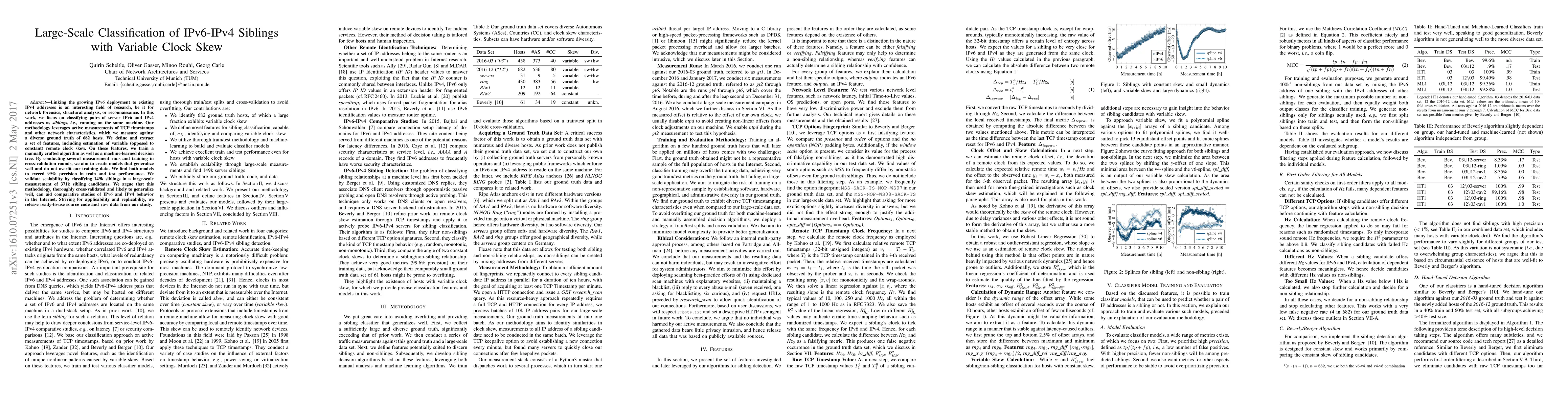 Linking the growing IPv6 deployment to existing IPv4 addresses is an interesting field of research, be it for network forensics, structural analysis, or reconnaissance. In this work, we focus on classifying pairs of server IPv6 and IPv4 addresses as siblings, i.e., running on the same machine. Our methodology leverages active measurements of TCP timestamps and other network characteristics, which we measure against a diverse ground truth of 682 hosts. We define and extract a set of features, including estimation of variable (opposed to constant) remote clock skew. On these features, we train a manually crafted algorithm as well as a machine-learned decision tree. By conducting several measurement runs and training in cross-validation rounds, we aim to create models that generalize well and do not overfit our training data. We find both models to exceed 99% precision in train and test performance. We validate scalability by classifying 149k siblings in a large-scale measurement of 371k sibling candidates. We argue that this methodology, thoroughly cross-validated and likely to generalize well, can aid comparative studies of IPv6 and IPv4 behavior in the Internet. Striving for applicability and replicability, we release ready-to-use source code and raw data from our study.