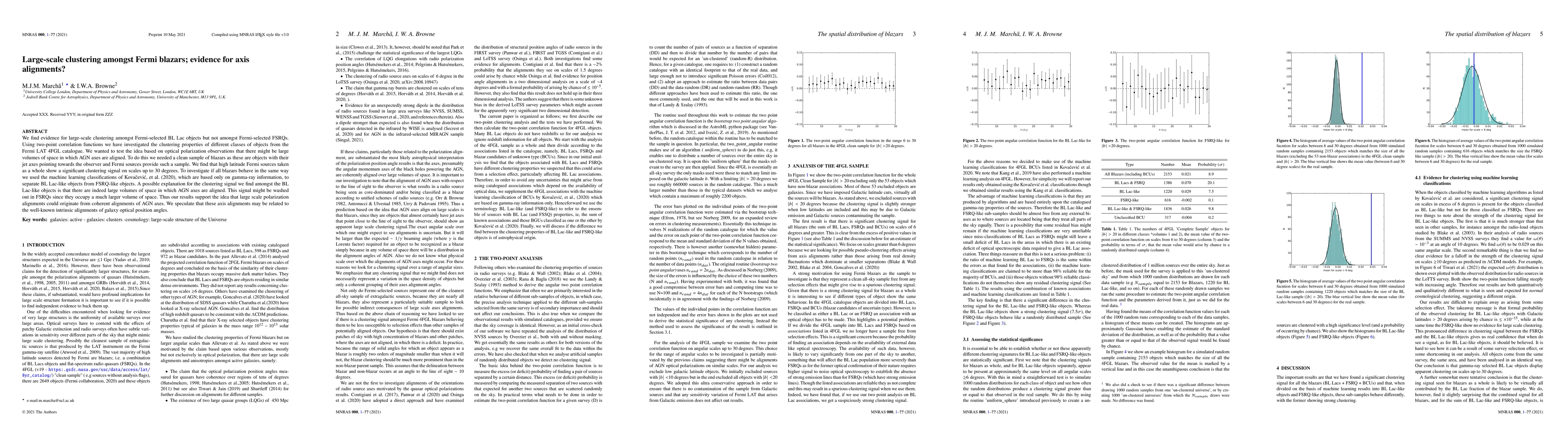 We find evidence for large-scale clustering amongst Fermi-selected BL Lac objects but not amongst Fermi-selected FSRQs. Using two-point correlation functions we have investigated the clustering properties of different classes of objects from the Fermi LAT 4FGL catalogue. We wanted to test the idea based on optical polarization observations that there might be large volumes of space in which AGN axes are aligned. To do this we needed a clean sample of blazars as these are objects with their jet axes pointing towards the observer and Fermi sources provide such a sample. We find that high latitude Fermi sources taken as a whole show a significant clustering signal on scales up to 30 degrees. To investigate if all blazars behave in the same way we used the machine learning classifications of Kovacevic, et al. (2020), which are based only on gamma-ray information, to separate BL Lac-like objects from FSRQ-like objects. A possible explanation for the clustering signal we find amongst the BL Lac-like objects is that there are indeed large volumes of space in which AGN axes are aligned. This signal might be washed out in FSRQs since they occupy a much larger volume of space. Thus our results support the idea that large scale polarization alignments could originate from coherent alignments of AGN axes. We speculate that these axis alignments may be related to the well-known intrinsic alignments of galaxy optical position angles.