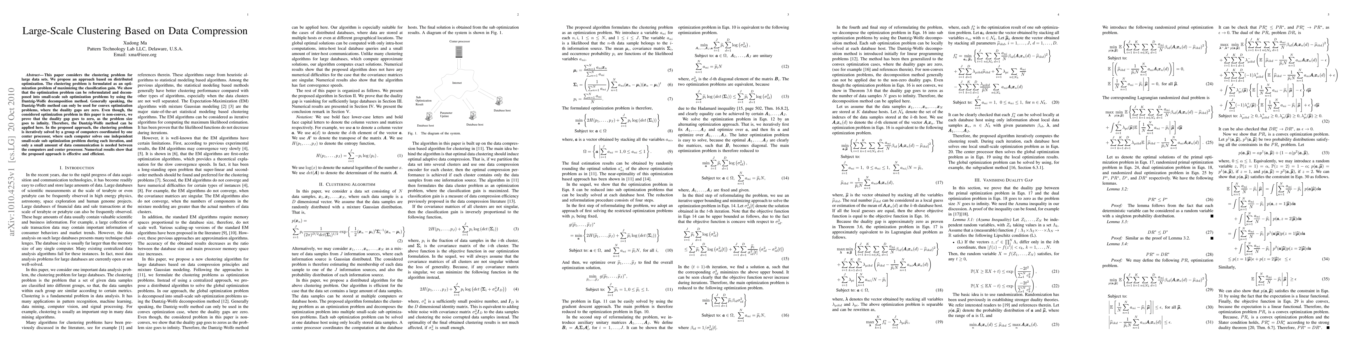 This paper considers the clustering problem for large data sets. We propose an approach based on distributed optimization. The clustering problem is formulated as an optimization problem of maximizing the classification gain. We show that the optimization problem can be reformulated and decomposed into small-scale sub optimization problems by using the Dantzig-Wolfe decomposition method. Generally speaking, the Dantzig-Wolfe method can only be used for convex optimization problems, where the duality gaps are zero. Even though, the considered optimization problem in this paper is non-convex, we prove that the duality gap goes to zero, as the problem size goes to infinity. Therefore, the Dantzig-Wolfe method can be applied here. In the proposed approach, the clustering problem is iteratively solved by a group of computers coordinated by one center processor, where each computer solves one independent small-scale sub optimization problem during each iteration, and only a small amount of data communication is needed between the computers and center processor. Numerical results show that the proposed approach is effective and efficient.