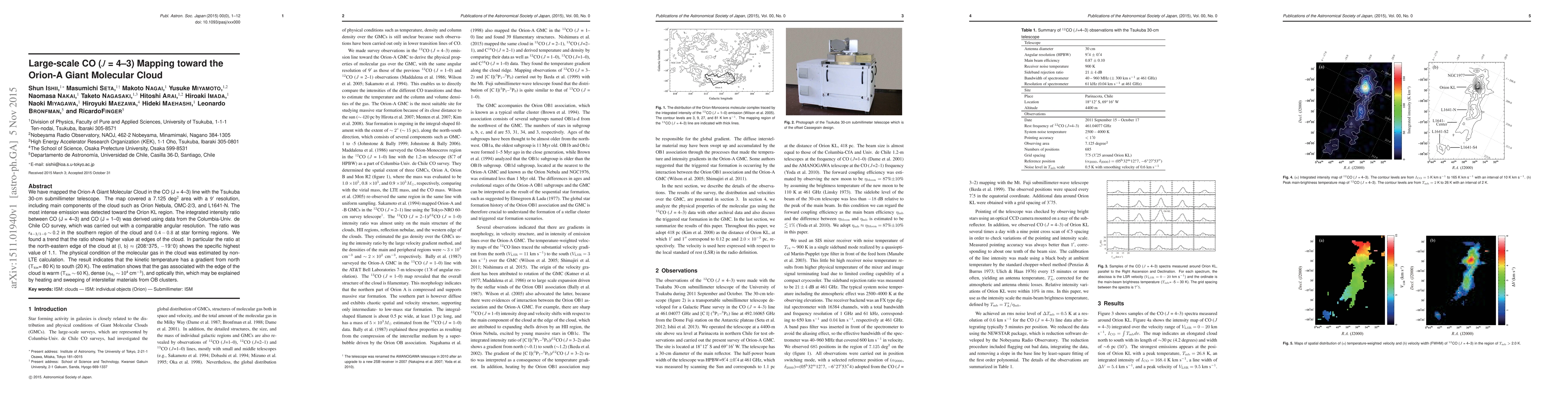 This study maps the Orion-A Giant Molecular Cloud using the CO (J=4-3) line with high resolution, revealing intense emission towards the Orion KL region. The kinetic temperature gradient from north to south and the higher CO intensity ratio at cloud edges suggest warm, dense gas influenced by OB clusters.
