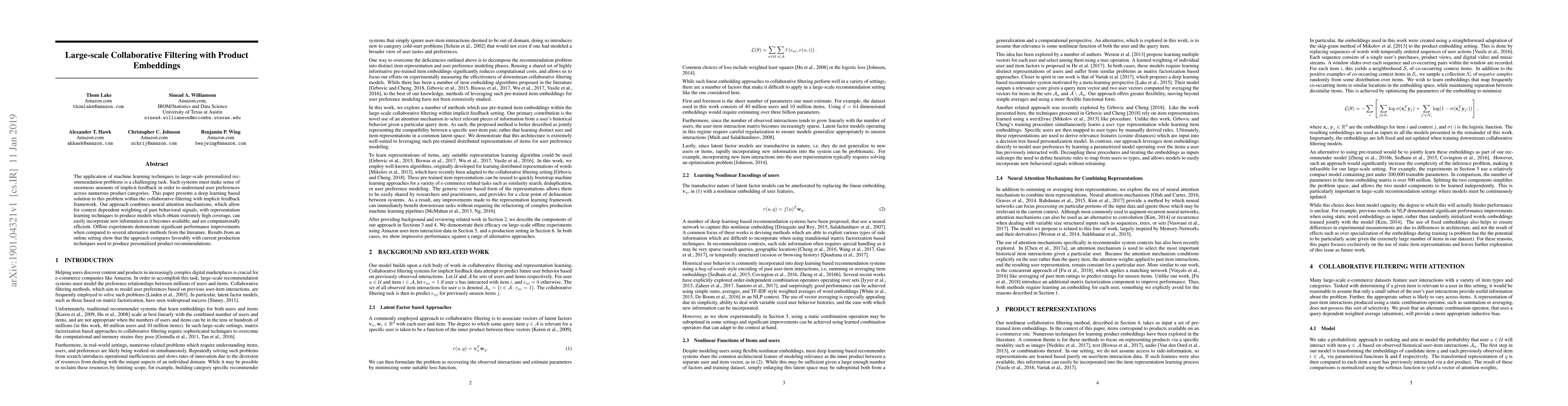 The application of machine learning techniques to large-scale personalized recommendation problems is a challenging task. Such systems must make sense of enormous amounts of implicit feedback in order to understand user preferences across numerous product categories. This paper presents a deep learning based solution to this problem within the collaborative filtering with implicit feedback framework. Our approach combines neural attention mechanisms, which allow for context dependent weighting of past behavioral signals, with representation learning techniques to produce models which obtain extremely high coverage, can easily incorporate new information as it becomes available, and are computationally efficient. Offline experiments demonstrate significant performance improvements when compared to several alternative methods from the literature. Results from an online setting show that the approach compares favorably with current production techniques used to produce personalized product recommendations.