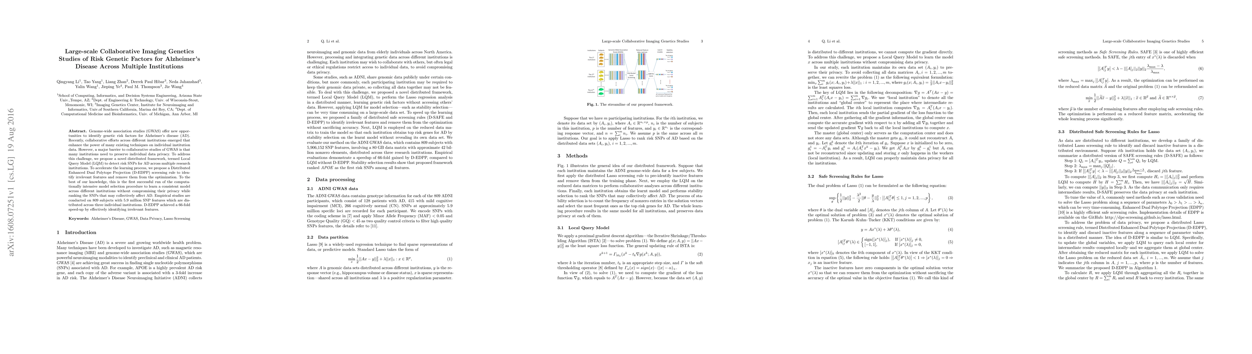 Genome-wide association studies (GWAS) offer new opportunities to identify genetic risk factors for Alzheimer's disease (AD). Recently, collaborative efforts across different institutions emerged that enhance the power of many existing techniques on individual institution data. However, a major barrier to collaborative studies of GWAS is that many institutions need to preserve individual data privacy. To address this challenge, we propose a novel distributed framework, termed Local Query Model (LQM) to detect risk SNPs for AD across multiple research institutions. To accelerate the learning process, we propose a Distributed Enhanced Dual Polytope Projection (D-EDPP) screening rule to identify irrelevant features and remove them from the optimization. To the best of our knowledge, this is the first successful run of the computationally intensive model selection procedure to learn a consistent model across different institutions without compromising their privacy while ranking the SNPs that may collectively affect AD. Empirical studies are conducted on 809 subjects with 5.9 million SNP features which are distributed across three individual institutions. D-EDPP achieved a 66-fold speed-up by effectively identifying irrelevant features.