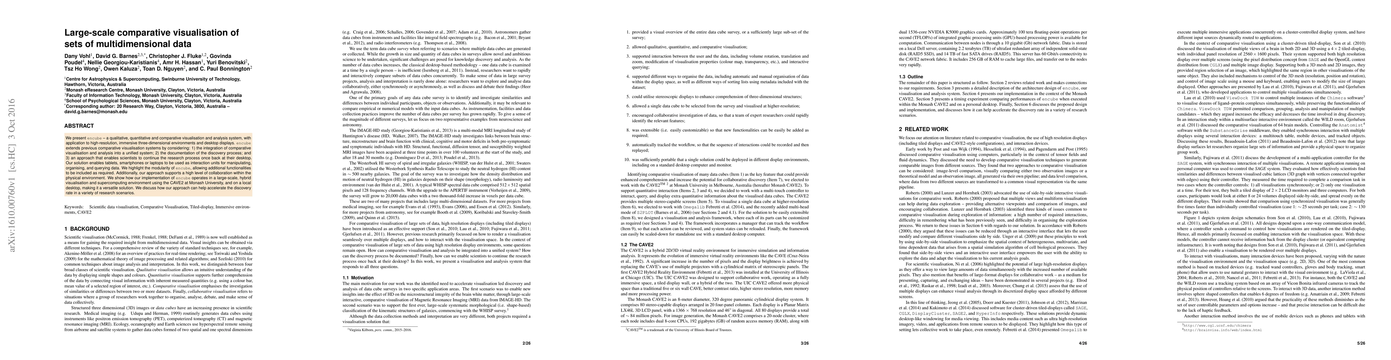 The paper introduces encube, a comprehensive system for comparative visualisation of multidimensional data, integrating qualitative and quantitative analysis in both immersive and desktop environments. The system supports collaborative discovery processes and is adaptable for various research scenarios, demonstrated through its use in a hybrid visualisation environment.