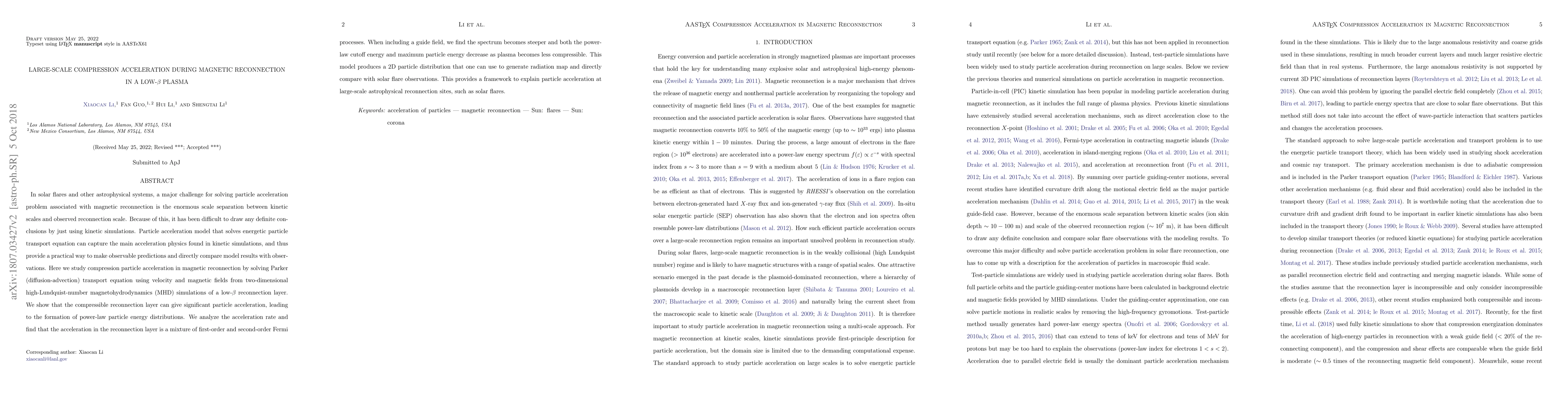 This paper investigates large-scale compression acceleration during magnetic reconnection in low-$\beta$ plasmas, demonstrating significant particle acceleration and power-law energy distributions using a combined kinetic and magnetohydrodynamics approach. The study finds that the acceleration mechanism is a mix of first and second-order Fermi processes, with guide fields leading to steeper spectra and reduced maximum particle energies.
