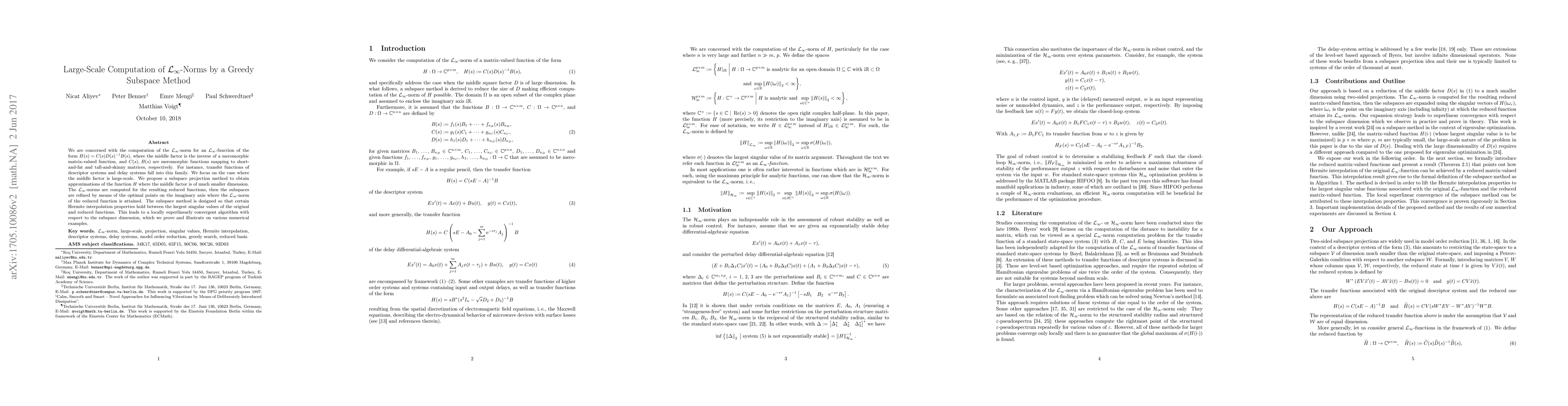 We are concerned with the computation of the ${\mathcal L}_\infty$-norm for an ${\mathcal L}_\infty$-function of the form $H(s) = C(s) D(s)^{-1} B(s)$, where the middle factor is the inverse of a meromorphic matrix-valued function, and $C(s),\, B(s)$ are meromorphic functions mapping to short-and-fat and tall-and-skinny matrices, respectively. For instance, transfer functions of descriptor systems and delay systems fall into this family. We focus on the case where the middle factor is large-scale. We propose a subspace projection method to obtain approximations of the function $H$ where the middle factor is of much smaller dimension. The ${\mathcal L}_\infty$-norms are computed for the resulting reduced functions, then the subspaces are refined by means of the optimal points on the imaginary axis where the ${\mathcal L}_\infty$-norm of the reduced function is attained. The subspace method is designed so that certain Hermite interpolation properties hold between the largest singular values of the original and reduced functions. This leads to a locally superlinearly convergent algorithm with respect to the subspace dimension, which we prove and illustrate on various numerical examples.